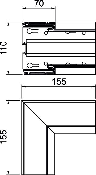 Angle range, min. 90 mm Antibacterial treatment no Cable retaining clip no CO2 Footprint (GWP) Cradle-to-Gate 11,0677 kg CO2e / 1 Piece Colour aluminium Cover mounting type Internal Cover width 79 mm Dimension 70x110x155 Duct connector no for duct dimension 70x110 for duct width 110 mm for trunking height 70 mm Halogen-free yes Height 70 mm Length 155 mm Material Aluminium Mounting perforation in base yes Number of covers 1 Permitted temperature range, max. 60 °C Permitted temperature range, min. -5 °C Protection rating IP30 Protection rating IK code IK07. Protective film yes Shape Asymmetrical Surface Anodised Version for Base Width 110 mm - All types