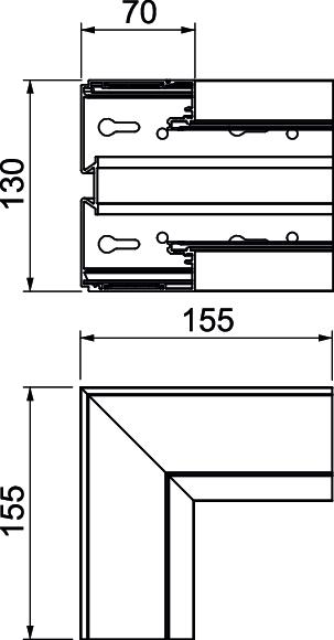 Angle range, min. 90 mm Antibacterial treatment no Cable retaining clip no CO2 Footprint (GWP) Cradle-to-Gate 12,2276 kg CO2e / 1 Piece Colour aluminium Cover mounting type Internal Cover width 79 mm Dimension 70x130x155 Duct connector no for duct dimension 70x130 for duct width 130 mm for trunking height 70 mm Halogen-free yes Height 70 mm Length 155 mm Material Aluminium Mounting perforation in base yes Number of covers 1 Permitted temperature range, max. 60 °C Permitted temperature range, min. -5 °C Protection rating IP30 Protection rating IK code IK07. Protective film yes Shape Asymmetrical Surface Anodised Version for Base Width 130 mm - All types