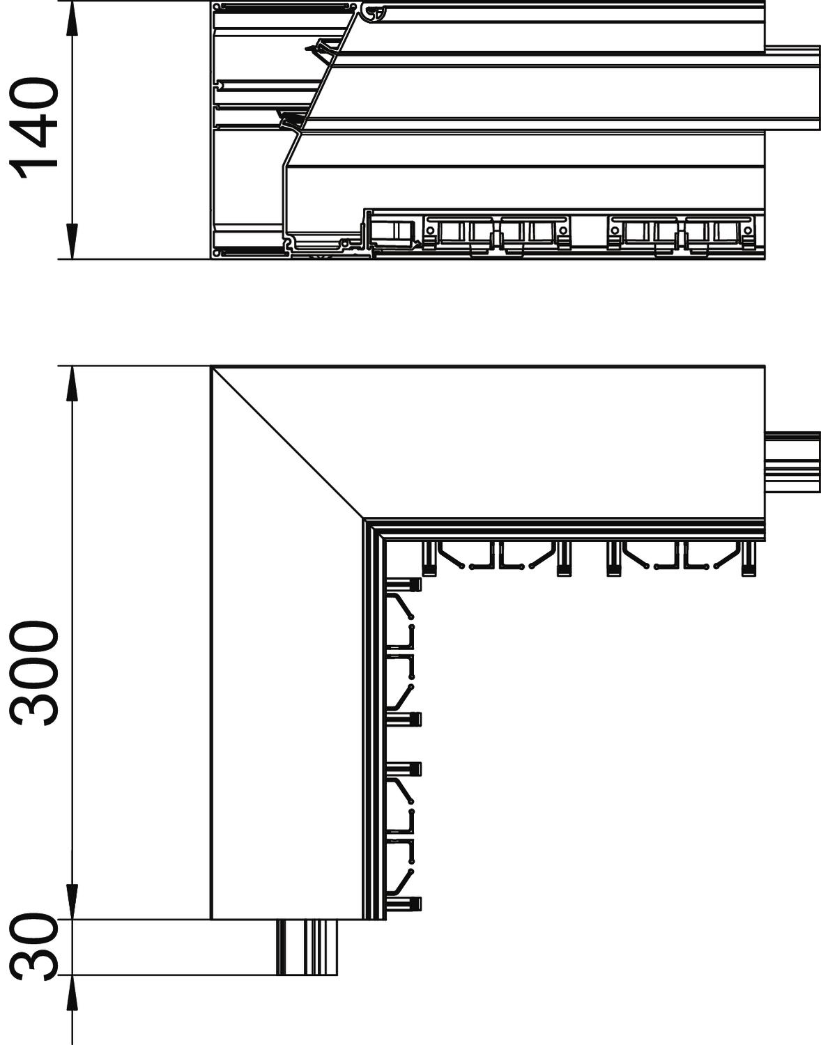 Angle range, max. 90 mm Angle range, min. 90 mm Antibacterial treatment no Cable retaining clip no CO2 Footprint (GWP) Cradle-to-Gate 24,6671 kg CO2e / 1 Piece Colour aluminium Cover mounting type Internal Cover width 45 mm Dimension 114x140x300 Duct connector no for duct dimension 114 x 140 mm for duct width 140 mm for trunking height 114 mm Halogen-free yes Height 114 mm Length 300 mm Material Aluminium Mounting perforation in base no Number of covers 1 Protective film yes Shape Asymmetrical Surface Anodised Version for Base and cover Width 140 mm - All types