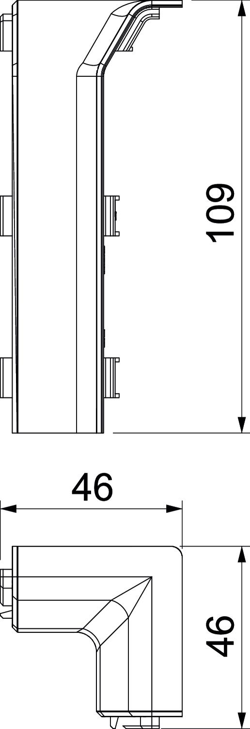 Angle range, min. 90 mm CO2 Footprint (GWP) Cradle-to-Gate 0,0305 kg CO2e / 1 Piece Colour Pure white; RAL 9010 Cover sealing lip Without Decoration Without Halogen-free no Height 109 mm Length 46 mm Material Polyvinylchloride Permitted temperature range, max. 60 °C Permitted temperature range, min. -5 °C Protection rating IP40 Protection rating IK code IK06 Version for Hood fitting Width 46 mm With carpet strip no - All types