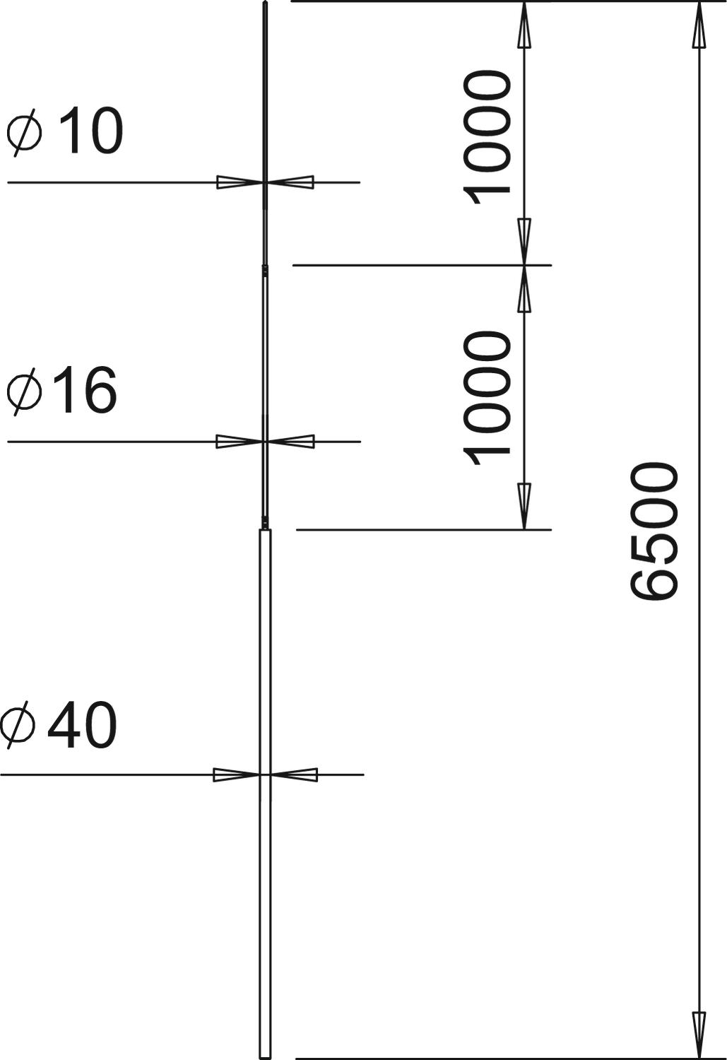 Diameter 40 mm Dimension 6500mm Dimension B 4500 mm Dimension D 1000 mm Dimension H 1000 mm High voltage-resistant, insulated version no Length 6500 mm Material Aluminium Nominal size Ø 40/ 16/ 10 mm Version for Air-termination rod with stand - All types