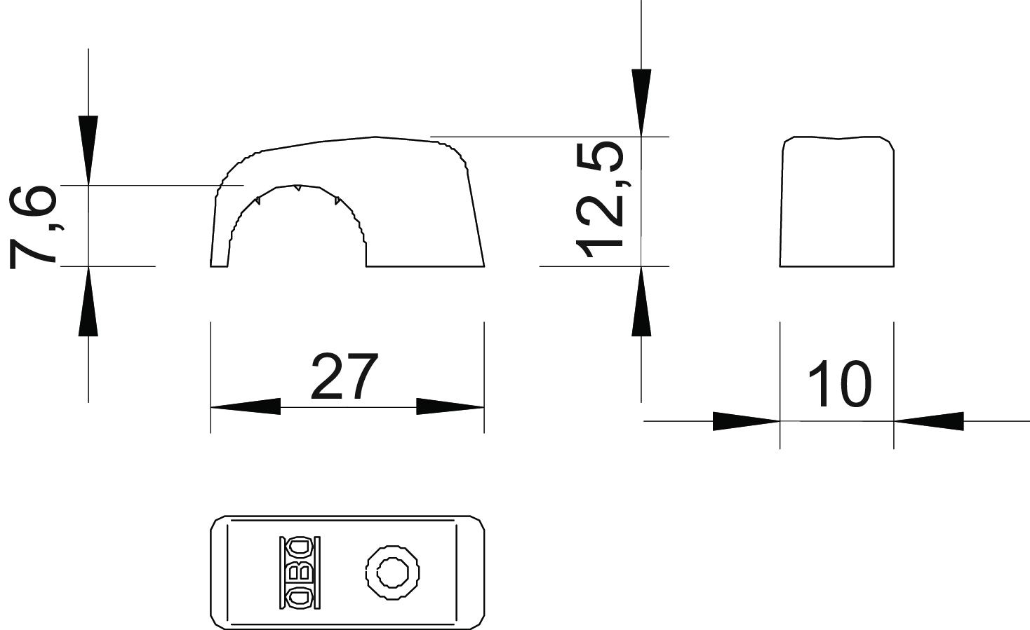 CO2 Footprint (GWP) Cradle-to-Gate 0,0044 kg CO2e / 1 Piece Colour Light grey; RAL 7035 Dimension 10-14mm Dimension B 10 mm Dimension H 12,5 mm Dimension H1 7,6 mm Dimension L 27 mm Double clip no for cable diameter, max. 14 mm for cable diameter, min. 10 mm For nail diameter 2,0 Halogen-free yes Hardened no Impact-resistant no Material Polypropylene Pipe locking no Shape Round (for round conductor) With nail no - All types