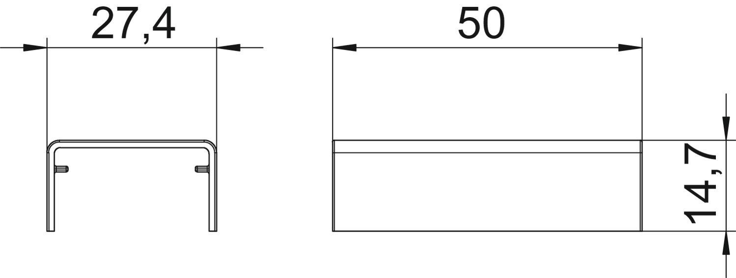 CO2 Footprint (GWP) Cradle-to-Gate 0,0552 kg CO2e / 1 Piece Colour Oyster white; RAL 1013 Dimension 15x27x50mm Fastening type Lockable Halogen-free no Height 14,7 mm Length 50 mm Material Polycarbonate/Acrylnitrile-butadiene-styrene Permitted temperature range, max. 60 °C Permitted temperature range, min. -5 °C Protection rating IP30 Protection rating IK code IK04 Shape Symmetrical Version for Trunking cut cover Width 27,4 mm - All types
