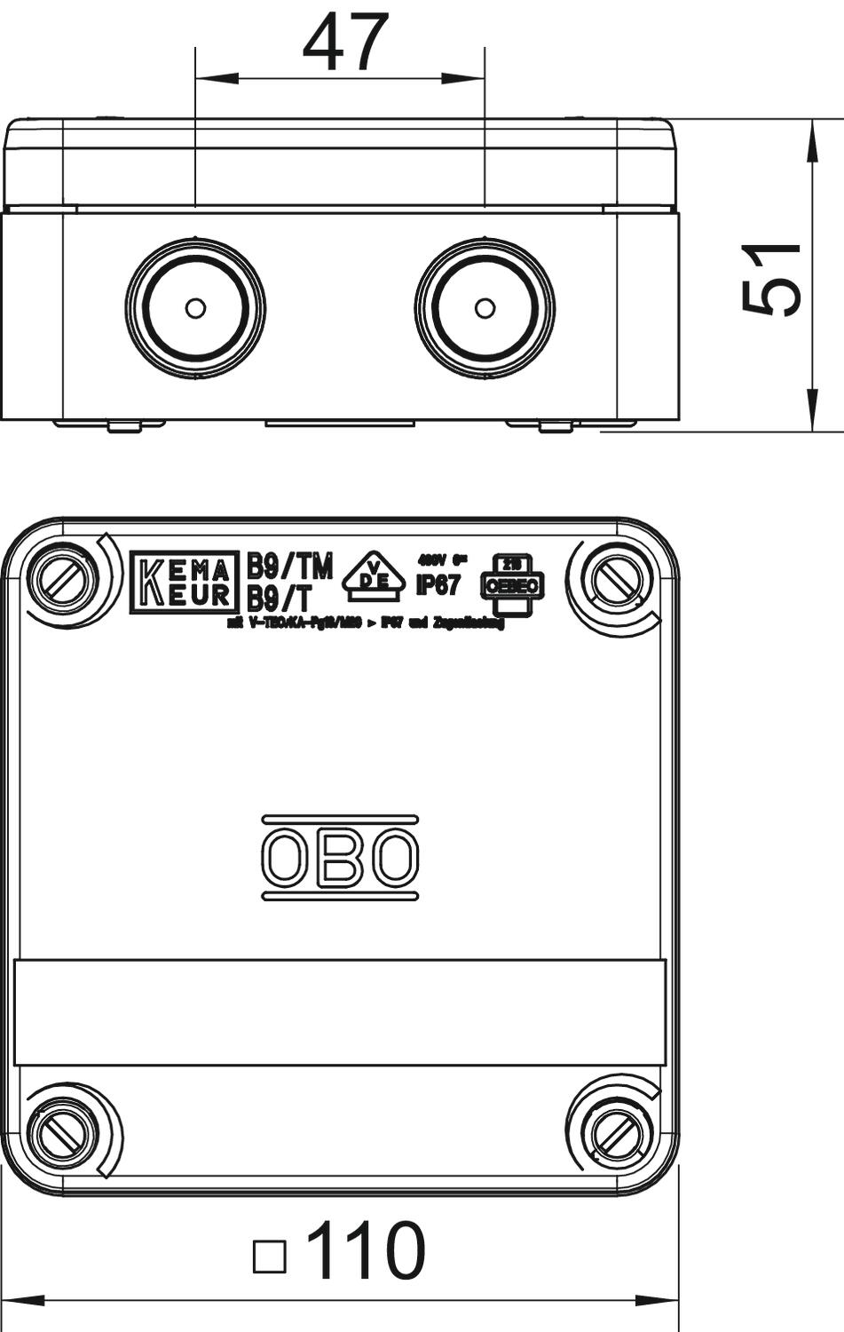 Clear internal dimensions 98x98x40 mm CO2 Footprint (GWP) Cradle-to-Gate 0,7247 kg CO2e / 1 Piece Colour Light grey; RAL 7035 Dimension 110x110x50 Entry from rear yes Expandable yes Explosion-tested version no For Ex zone Without For Ex zone dust Without For Ex zone gas Without Halogen-free yes Height 51 mm Length 110 mm Maintain electrical functions Without Material Polypropylene Max. Conductor cross-section 6 mm² Measured insulation voltage Vi 400 V Mounting type Wall/ceiling mounting No. of entries 9 Nominal cross-section, max. 6 mm² Nominal cross-section, min. 4 mm² Nominal voltage 400 V Permitted temperature range, max. 60 °C Permitted temperature range, min. -5 °C Protection rating IP67 Sealable yes Type of entry Cable/gland Type of entry Cable Type of housing penetration Thread and sealing membrane Weatherproof no Width 110 mm with lid yes - All types