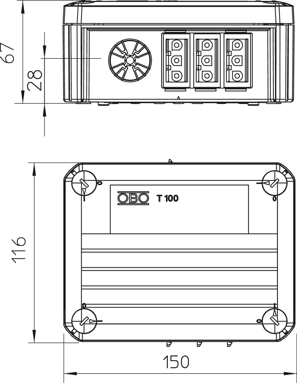 Clear internal dimensions 136x102x57 mm CO2 Footprint (GWP) Cradle-to-Gate 0,6146 kg CO2e / 1 Piece Colour Light grey; RAL 7035 Cover Not transparent Cover fastening Screwed Dimension 150x116x67 Entry from rear yes Equipment Miscellaneous Expandable yes Explosion-tested version no Flame-resistant acc. to VDE 0471/DIN 695 Part 2-1, test temperature 650°C For Ex zone Without For Ex zone dust Without For Ex zone gas Without Halogen-free yes Height 67 mm Length 150 mm Maintain electrical functions Without Material Polypropylene Measured insulation voltage Vi 500 V Mounting type Wall/ceiling mounting No. of entries 4 Nominal cross-section, min. 2,5 mm² Nominal voltage 500 V Permitted temperature range, max. 60 °C Permitted temperature range, min. -5 °C Protection rating IP20 Sealable yes Shape Rectangular Transparent lid no Type of entry Strain relief entries for direct penetrations for cable diameters of 7−21 mm Type of housing penetration Pre-marking Weatherproof no Width 116 mm with lid yes With screening no - All types