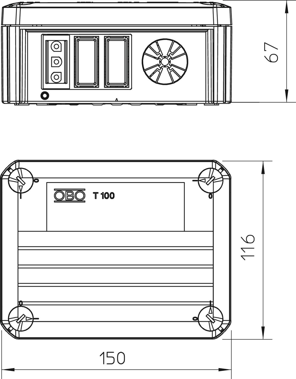 Clear internal dimensions 136x102x57 mm CO2 Footprint (GWP) Cradle-to-Gate 0,6448 kg CO2e / 1 Piece Colour Light grey; RAL 7035 Cover Not transparent Cover fastening Screwed Dimension 150x116x67 Entry from rear yes Equipment Miscellaneous Expandable yes Explosion-tested version no Flame-resistant acc. to VDE 0471/DIN 695 Part 2-1, test temperature 650°C For Ex zone Without For Ex zone dust Without For Ex zone gas Without Halogen-free yes Height 67 mm Length 150 mm Maintain electrical functions Without Material Polypropylene Measured insulation voltage Vi 500 V No. of entries 4 Nominal cross-section, min. 2,5 mm² Nominal voltage 500 V Permitted temperature range, max. 60 °C Permitted temperature range, min. -5 °C Protection rating IP20 Sealable yes Shape Rectangular Transparent lid no Type of entry Strain relief entries for direct penetrations for cable diameters of 7−21 mm Type of housing penetration Pre-marking Weatherproof no Width 116 mm with lid yes With screening no - All types