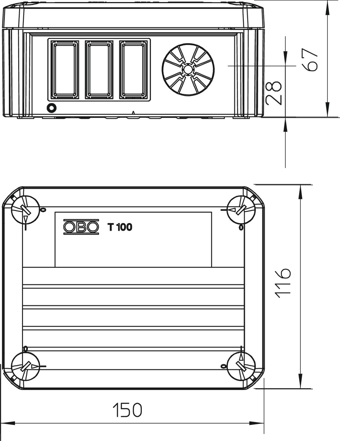 Clear internal dimensions 136x102x57 mm CO2 Footprint (GWP) Cradle-to-Gate 0,5886 kg CO2e / 1 Piece Colour Light grey; RAL 7035 Cover Not transparent Cover fastening Screwed Dimension 150x116x67 Entry from rear yes Equipment Miscellaneous Expandable yes Explosion-tested version no Flame-resistant acc. to VDE 0471/DIN 695 Part 2-1, test temperature 650°C For Ex zone Without For Ex zone dust Without For Ex zone gas Without Halogen-free yes Height 67 mm Length 150 mm Maintain electrical functions Without Material Polypropylene Measured insulation voltage Vi 500 V Mounting type Wall/ceiling mounting No. of entries 4 Nominal cross-section, min. 2,5 mm² Nominal voltage 500 V Permitted temperature range, max. 60 °C Permitted temperature range, min. -5 °C Protection rating IP20 Sealable yes Shape Rectangular Transparent lid no Type of entry Strain relief entries for direct penetrations for cable diameters of 7−21 mm Type of housing penetration Pre-marking Weatherproof no Width 116 mm with lid yes With screening no - All types
