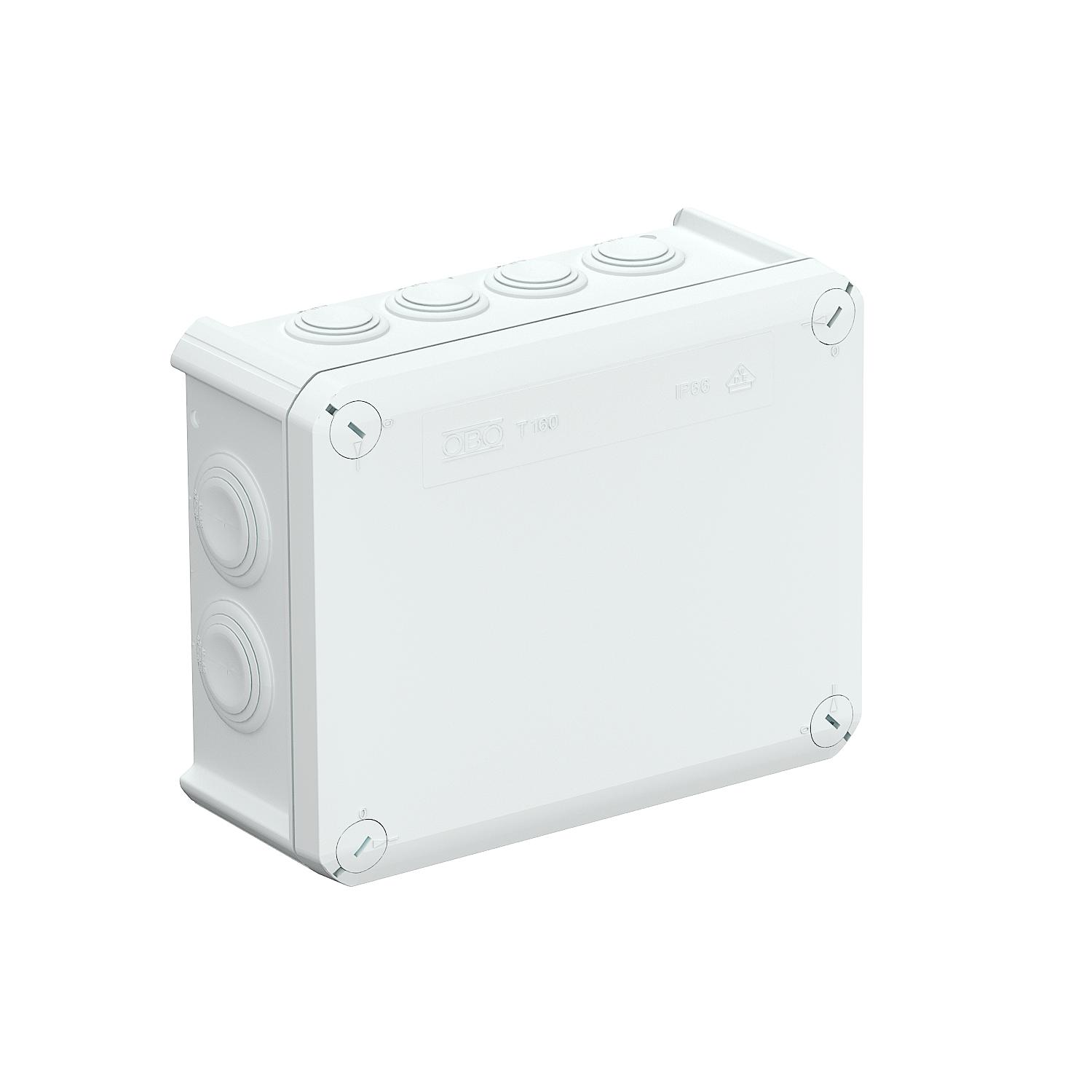 Product descriptionJunction box for the connection of cables and lines indoors and in protected outdoor areas. Rectangular design with plug-in seals to the sides and knock-out entries in the bottom. Suitable for wall and ceiling mounting and on mounting panels. With the option to fasten inside and to mount via the corner domes. Cover with quick lock, sealable. Flame-resistant type made from special polypropylene.