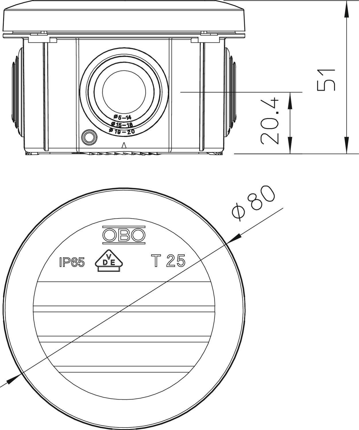 Clear internal dimensions Ø63x45 mm CO2 Footprint (GWP) Cradle-to-Gate 0,2788 kg CO2e / 1 Piece Colour Light grey; RAL 7035 Cover Not transparent Cover fastening Locking Diameter 80 mm Dimension Ø80x51 Entry from rear yes Equipment Terminal Expandable yes Explosion-tested version no Fibre-glass reinforced no Flame-resistant acc. to VDE 0471/DIN 695 Part 2-1, test temperature 650°C For Ex zone Without For Ex zone dust Without For Ex zone gas Without Halogen-free yes Height 51 mm Maintain electrical functions Without Material Polypropylene Measured insulation voltage Vi 500 V Mounting type Wall/ceiling mounting No. of entries 4 Nominal cross-section, min. 2,5 mm² Nominal voltage 500 V Number of terminals 5 Permitted temperature range, max. 60 °C Permitted temperature range, min. -5 °C Protection rating IP65 Protection rating IK code IK07. Sealable no Shape Round Transparent lid no Type of entry Plug-in seal Type of entry Cable Type of housing penetration Cuttable stepped membrane Weatherproof no with lid yes With screening no - All types