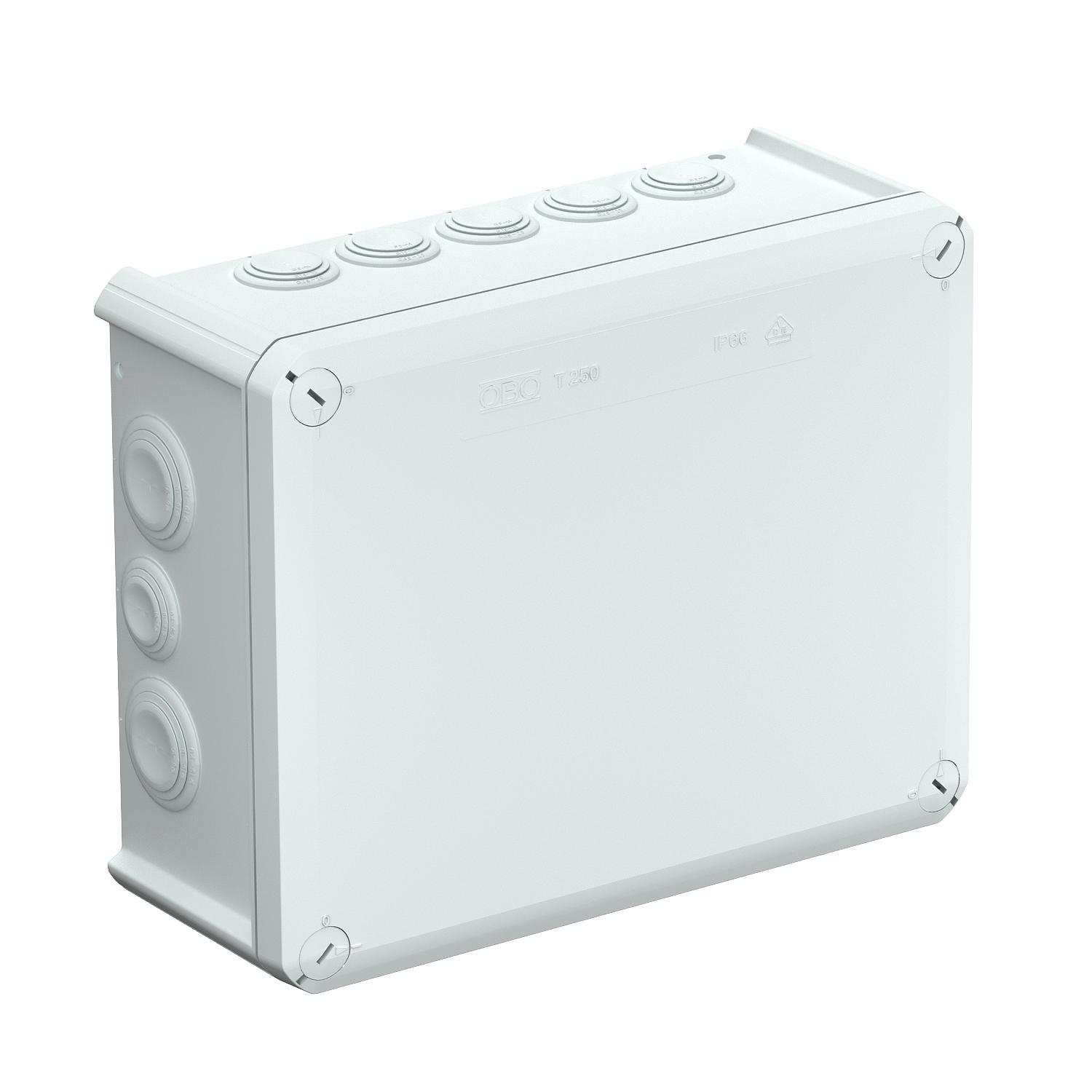 Product descriptionJunction box for the connection of cables and lines indoors and in protected outdoor areas. Rectangular design with plug-in seals to the sides and knock-out entries in the bottom. Suitable for wall and ceiling mounting, on mounting panels and threads in the floor. With the option to fasten inside and to mount via the corner domes. Cover with quick lock, sealable. Made from halogen-free materials. Flame-resistant type made from special polypropylene.