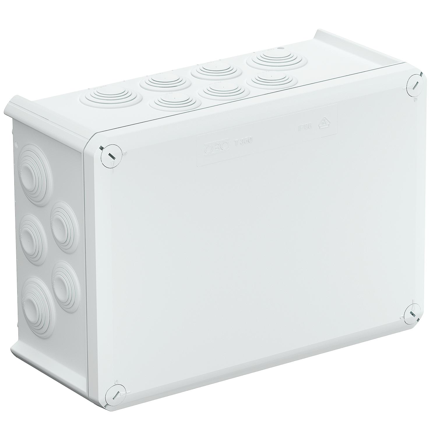 Product descriptionJunction box for the connection of cables and lines indoors and in protected outdoor areas. Rectangular design with plug-in seals to the sides and knock-out entries in the bottom. Suitable for wall and ceiling mounting and on mounting panels. With the option to fasten inside and to mount via the corner domes. Cover with quick lock, sealable. Made from halogen-free and UV-resistant materials.