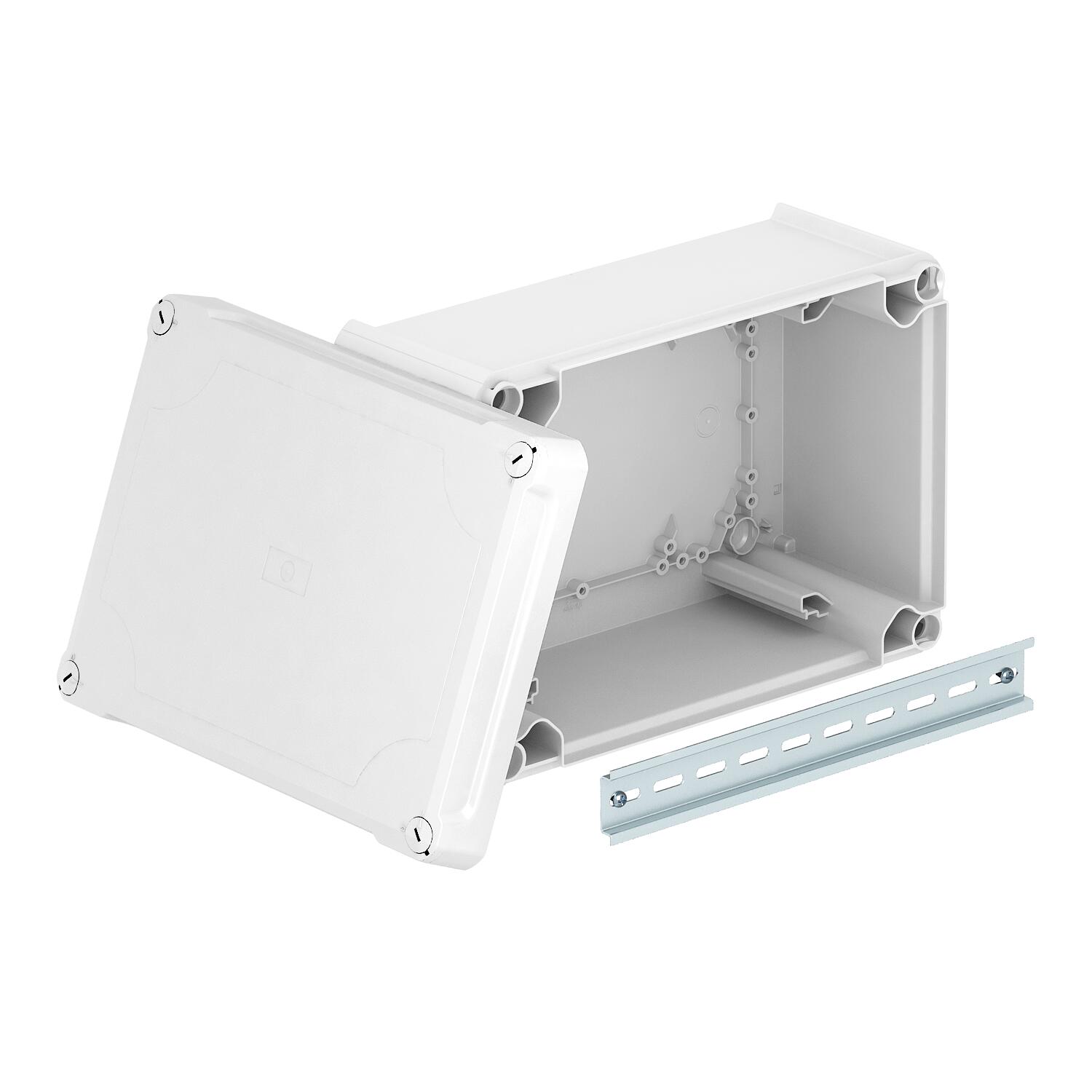 Product descriptionClosed junction box for the connection of cables and lines indoors and in protected outdoor areas. Rectangular design without entries. Suitable for wall and ceiling mounting, on mounting panels and threads in the floor. With the option to fasten inside and to mount via the corner domes. High, transparent cover with quick lock, sealable. Made from halogen-free and UV-resistant materials.