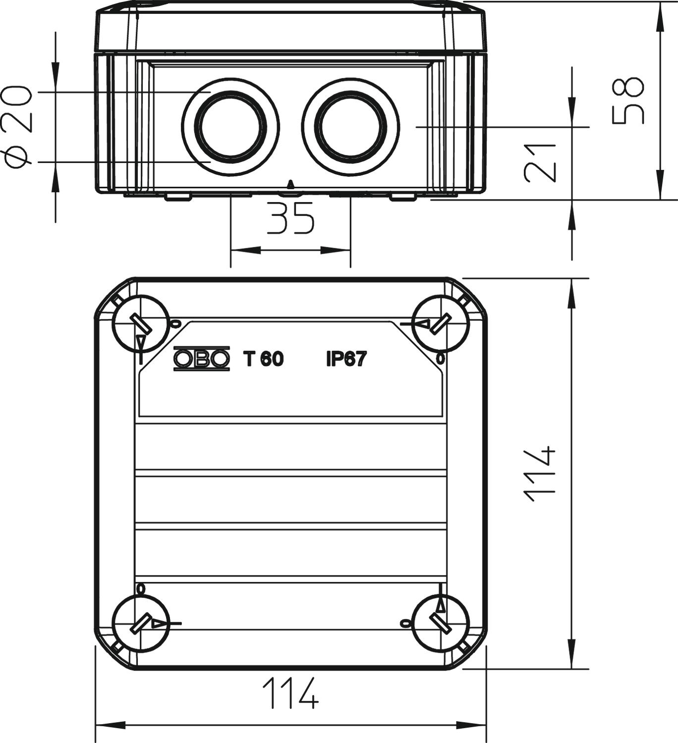 Clear internal dimensions 100x100x48 mm CO2 Footprint (GWP) Cradle-to-Gate 0,7154 kg CO2e / 1 Piece Colour Light grey; RAL 7035 Cover Not transparent Cover fastening Screwed Dimension 114x114x57 Entry from rear yes Equipment Terminal Expandable yes Explosion-tested version no Fibre-glass reinforced no Flame-resistant acc. to VDE 0471/DIN 695 Part 2-1, test temperature 650°C For Ex zone Without For Ex zone dust Without For Ex zone gas Without Halogen-free yes Height 57 mm Length 114 mm Maintain electrical functions Without Material Polypropylene Measured insulation voltage Vi 500 V Mounting type Wall/ceiling mounting No. of entries 7 Nominal cross-section, min. 6 mm² Nominal voltage 500 V Permitted temperature range, max. 60 °C Permitted temperature range, min. -5 °C Protection rating IP67 Protection rating IK code IK07. Sealable yes Shape Square Transparent lid no Type of entry Plug-in seal Type of entry Gland Type of housing penetration Pre-marking Weatherproof no Width 114 mm with lid yes With screening no - All types