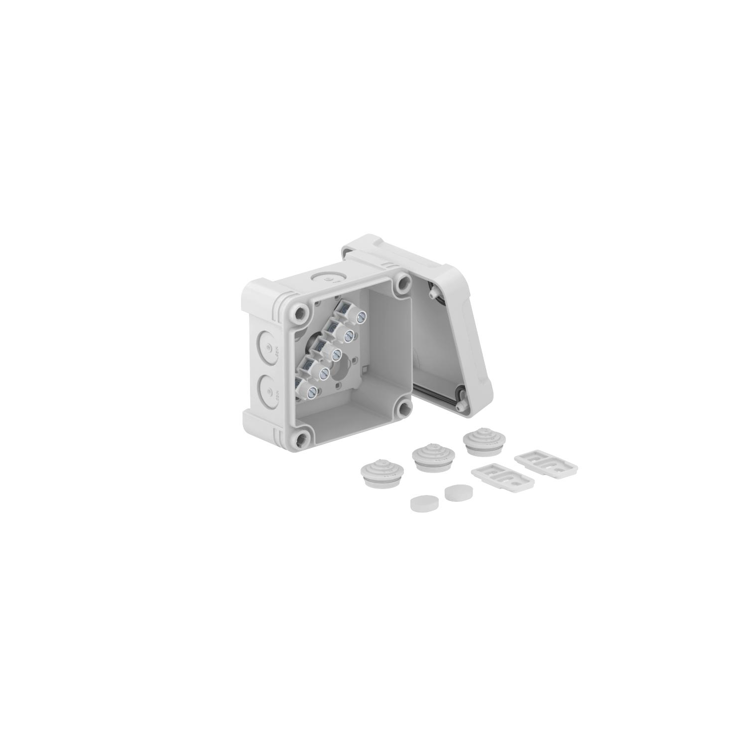 Product descriptionJunction box with terminal strip for the connection of cables and lines indoors and in outdoor areas. Square design with knock-out entries. Suitable for wall and ceiling mounting with the option to fasten outside, inside or to mount via the corner domes. Particularly impact resistant with IK09. Cover with quick lock, sealable. Made from halogen-free and UV-resistant materials.