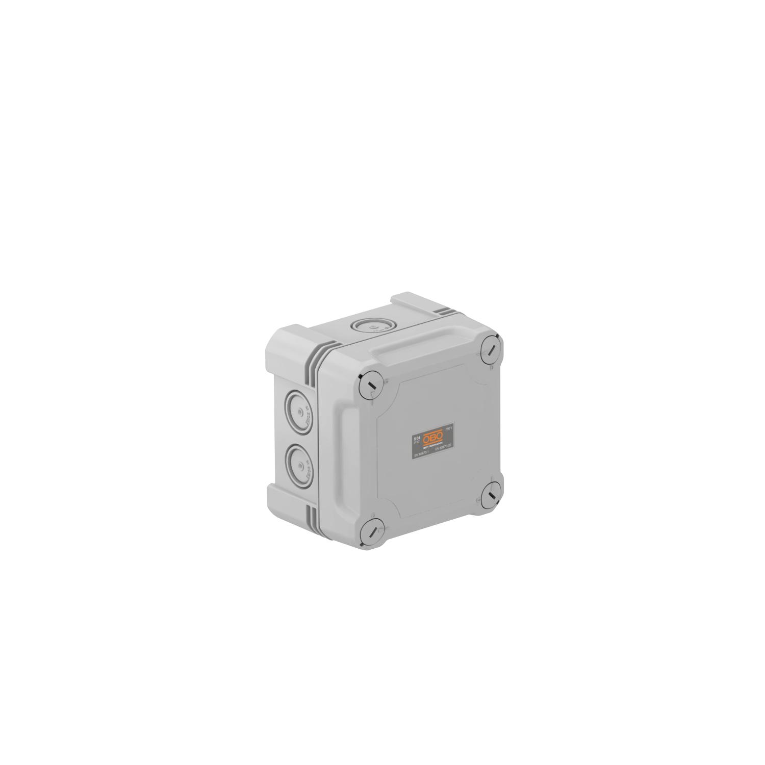 Product descriptionJunction box for the connection of cables and lines indoors and in outdoor areas. Square design with knock-out entries. Suitable for wall and ceiling mounting with the option to fasten outside, inside or to mount via the corner domes. Particularly impact resistant with IK09. Cover with quick lock, sealable. Made from halogen-free and UV-resistant materials.