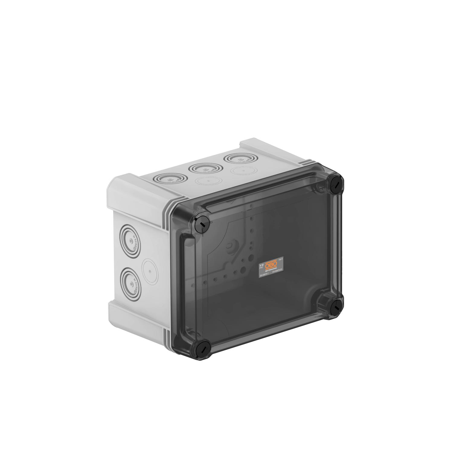 Product descriptionJunction box for the connection of cables and lines indoors and in outdoor areas. Rectangular design with knock-out entries. Suitable for wall and ceiling mounting with the option to fasten outside, inside or to mount via the corner domes. Particularly impact resistant with IK09. Transparent cover with quick lock, sealable. Made from halogen-free and UV-resistant materials.