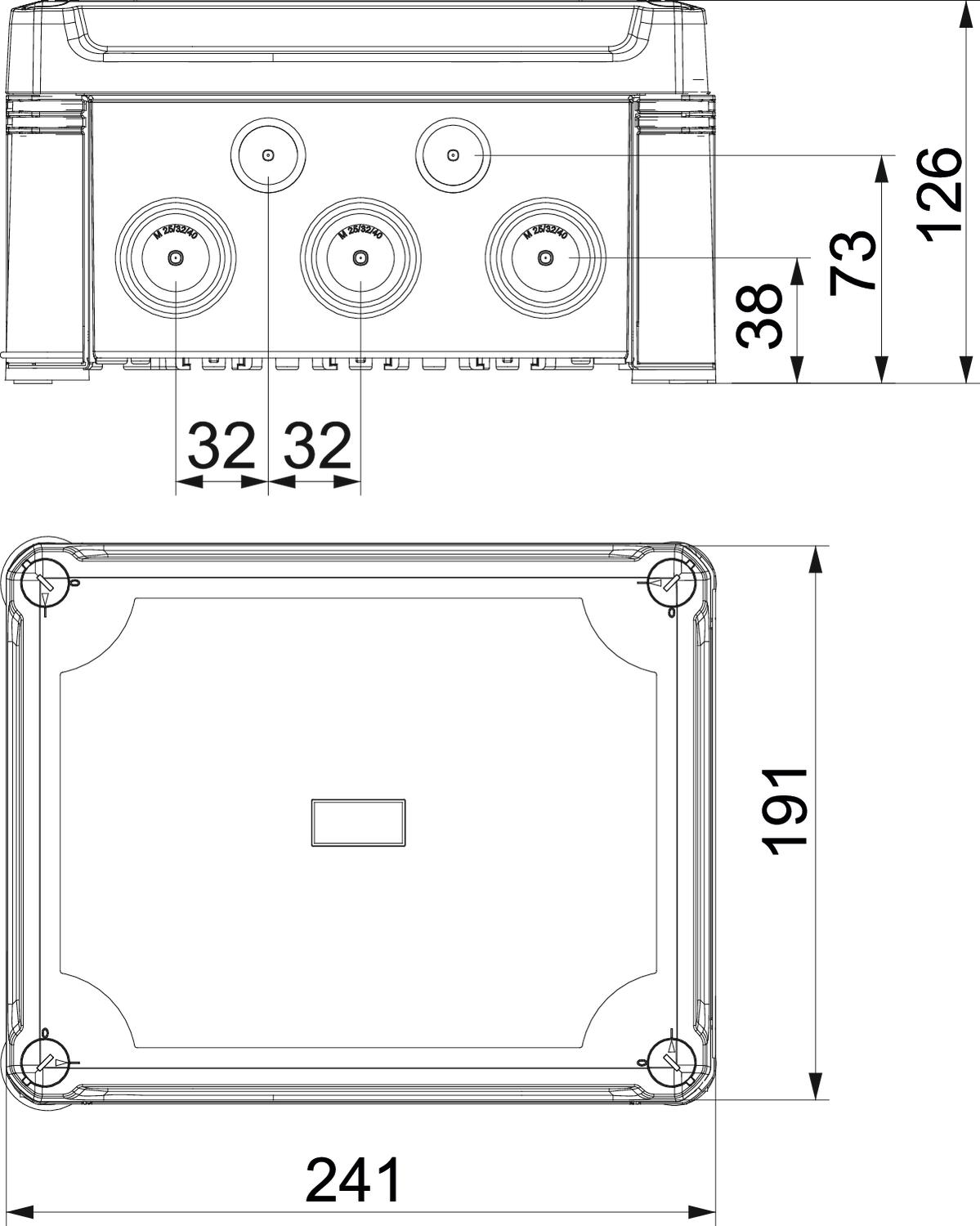 Clear internal dimensions 227x177x110 mm CO2 Footprint (GWP) Cradle-to-Gate 3,6174 kg CO2e / 1 Piece Colour Light grey; RAL 7035 Cover Not transparent Cover fastening Screwed Dimension 240x191x125 Entry from rear no Equipment Terminal Expandable yes Explosion-tested version no Fibre-glass reinforced yes Flame-resistant acc. to VDE 0471/DIN 695 Part 2-1, test temperature 650°C Halogen-free yes Height 126 mm Impact-resistant yes Length 241 mm Material Polycarbonate Max. Conductor cross-section 16 mm² Measured insulation voltage Vi 750 V Mounting type Wall/ceiling mounting No. of entries 10 Nominal cross-section, max. 16 mm² Nominal cross-section, min. 6 mm² Nominal voltage 750 V Permitted temperature range, max. 60 °C Permitted temperature range, min. -5 °C Protection rating IP67 Protection rating IK code IK09 Sealable yes Shape Rectangular Transparent lid no Type of entry Cuttable stepped membrane Type of housing penetration Pre-marking Weatherproof yes Width 191 mm with lid yes With screening no - All types