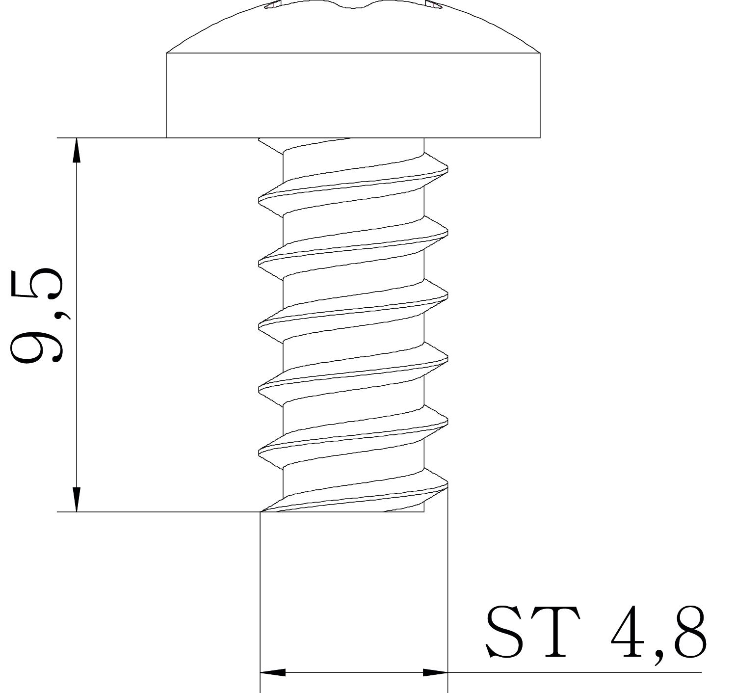 Colour zinc Dimension 4,8x9,5 Dimension 4,8x9,5 Dimension d 4,8 mm Dimension L 9,5 mm Fibre-glass reinforced no Halogen-free yes Head diameter 9,5 mm Head shape Rounded head Impact-resistant no Length 13,05 mm Material Steel Rustproof steel, pickled no Screw system Torx Surface Electrogalvanized Thread diameter ST 4,8 Thread length 9,5 mm Width 9,5 mm With nut no With washer no - All types