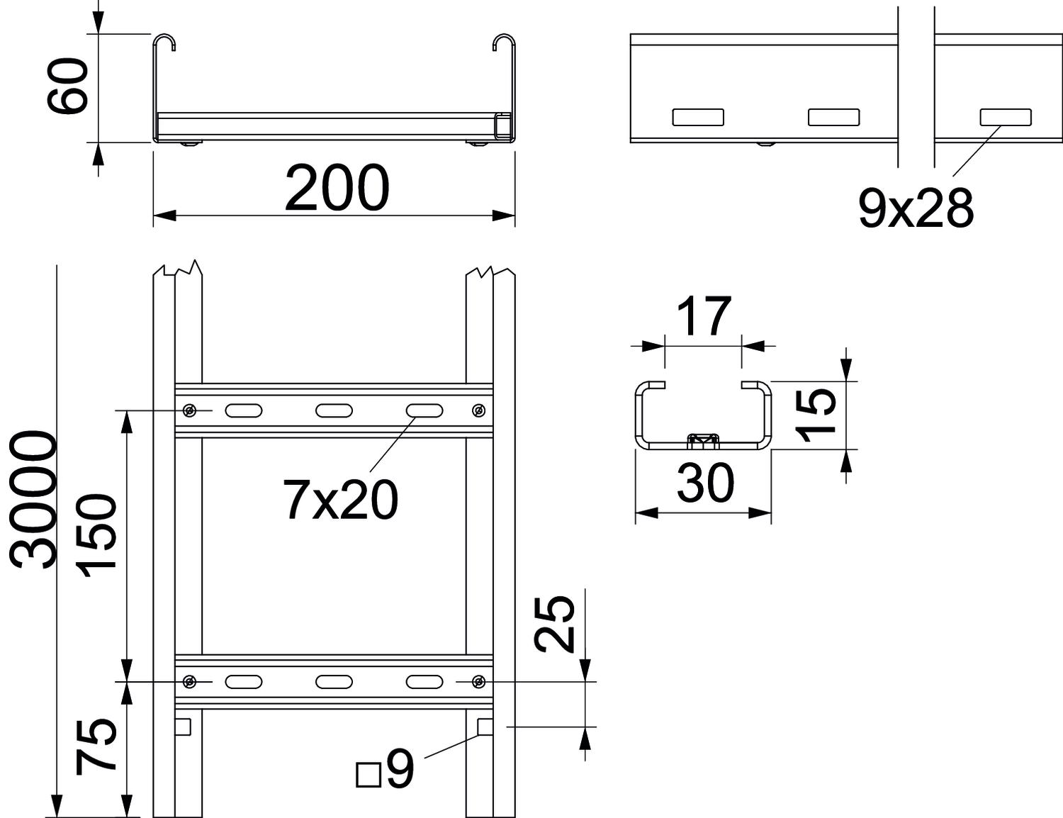 CO2 Footprint (GWP) Cradle-to-Gate 7,6104 kg CO2e / 1 Meter Colour zinc Dimension 60x200x3000 Dimension B 200 mm Fastening of rung Blind riveted Fire protection Maintenance of electrical function of standard support structure Height 60 mm Length 3000 mm Maintain electrical functions yes Material Steel Rail thickness 1,5 mm Rung distance 150 mm Rung slot dimension 17,00 Rustproof steel, pickled no Side perforation yes Side rail version Profile (open) Surface Strip galvanized Usable cross-section 9800 mm² Version of the rungs Profile perforated Wide-span version no Width 200 mm - All types