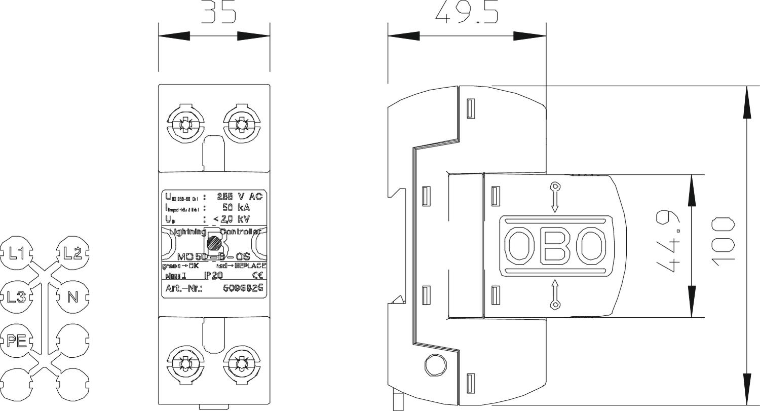 Arrester surge current (8/20 µs) [total] 50 kA Blow-out no CO2 Footprint (GWP) Cradle-to-Gate 2,0707 kg CO2e / 1 Piece Conductor cross-section, rigid (single-wire/multiwire), max. 50 mm² Conductor cross-section, rigid (single-wire/multiwire), min. 10 mm² Dimension 255V Explosion-tested version no Height 69 mm Installation type DIN rail 35 mm Length 100 mm Lightning protection zone LPZ 0→1 Lightning surge current (10/350 μs) 50 kA Lightning surge current (10/350) 50 kA Max. mains-side overcurrent protection 500 Maximum back-up fuse 500 A Maximum continuous voltage AC 255 V Network form Other Nominal discharge current (8/20 µs) 50 kA Nominal voltage AC (50/60 Hz) 230 V Operating temperature, max. 85 °C Operating temperature, min. -40 °C Permitted temperature range, max. 85 °C Permitted temperature range, min. -40 °C Pole version 1 Protection rating IP20 Remote signalling no Response time <100 ns Signalling on device Visual SPD to EN 61643-11 Type 1 SPD to IEC 61643-1 Class I Test class, type 1 yes Width 35 mm - All types