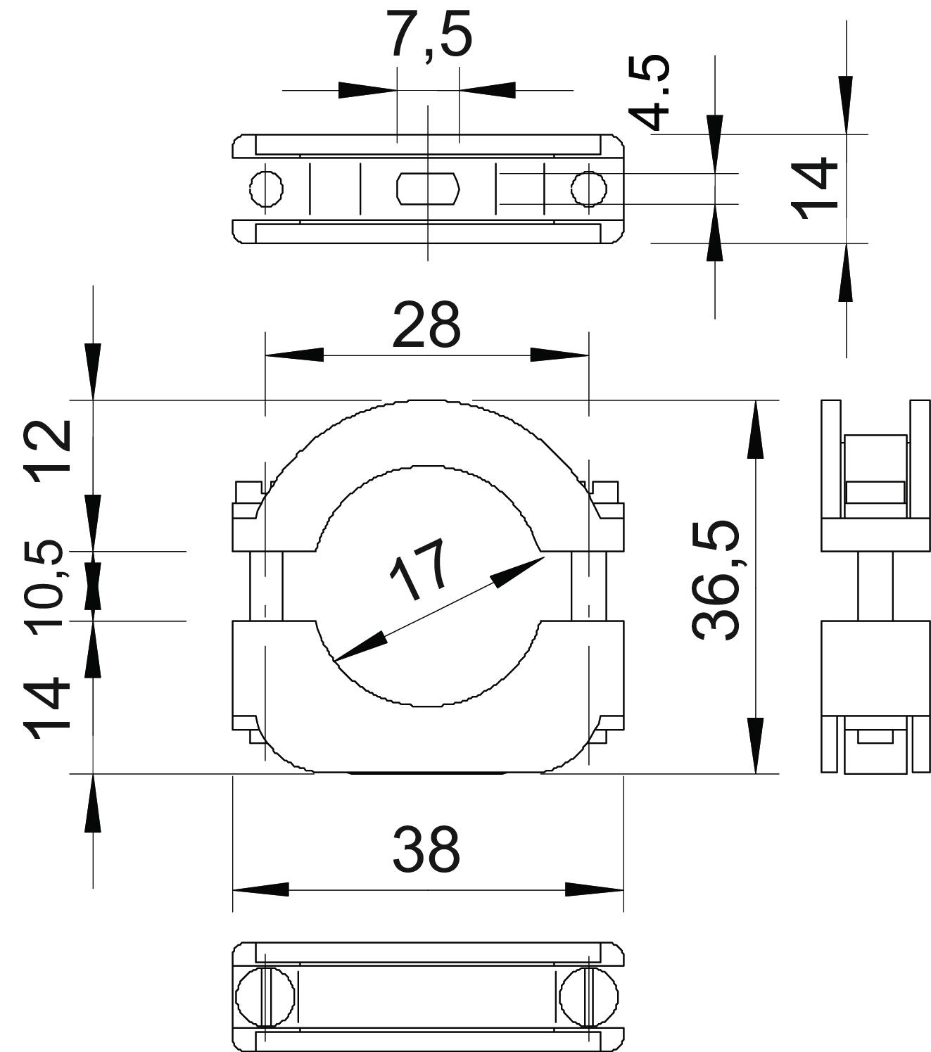 Bolt M4 x 25 Clamping range D, max. 17 mm Clamping range D, min. 10 mm CO2 Footprint (GWP) Cradle-to-Gate 0,0626 kg CO2e / 1 Piece Colour Light grey; RAL 7035 Dimension 10-17mm Dimension A 38 mm Dimension B 28 mm Dimension b 14 mm Dimension D 17 mm Dimension H 36,5 mm Dimension Ho (mm) 12 Dimension Hu (mm) 14 Dimension L 7,5 mm Fastening type Screw hole Halogen-free yes Material Polystyrene Number of cables/pipes 1 Plastic-covered no Suitable in fire protection area no UV-resistant no Version for Closed - All types