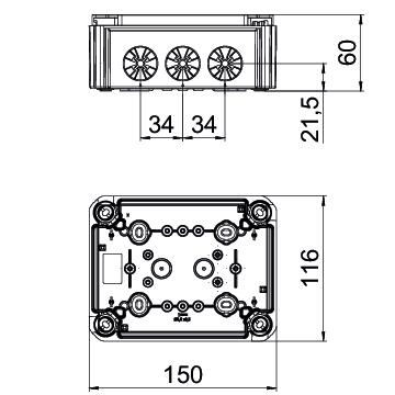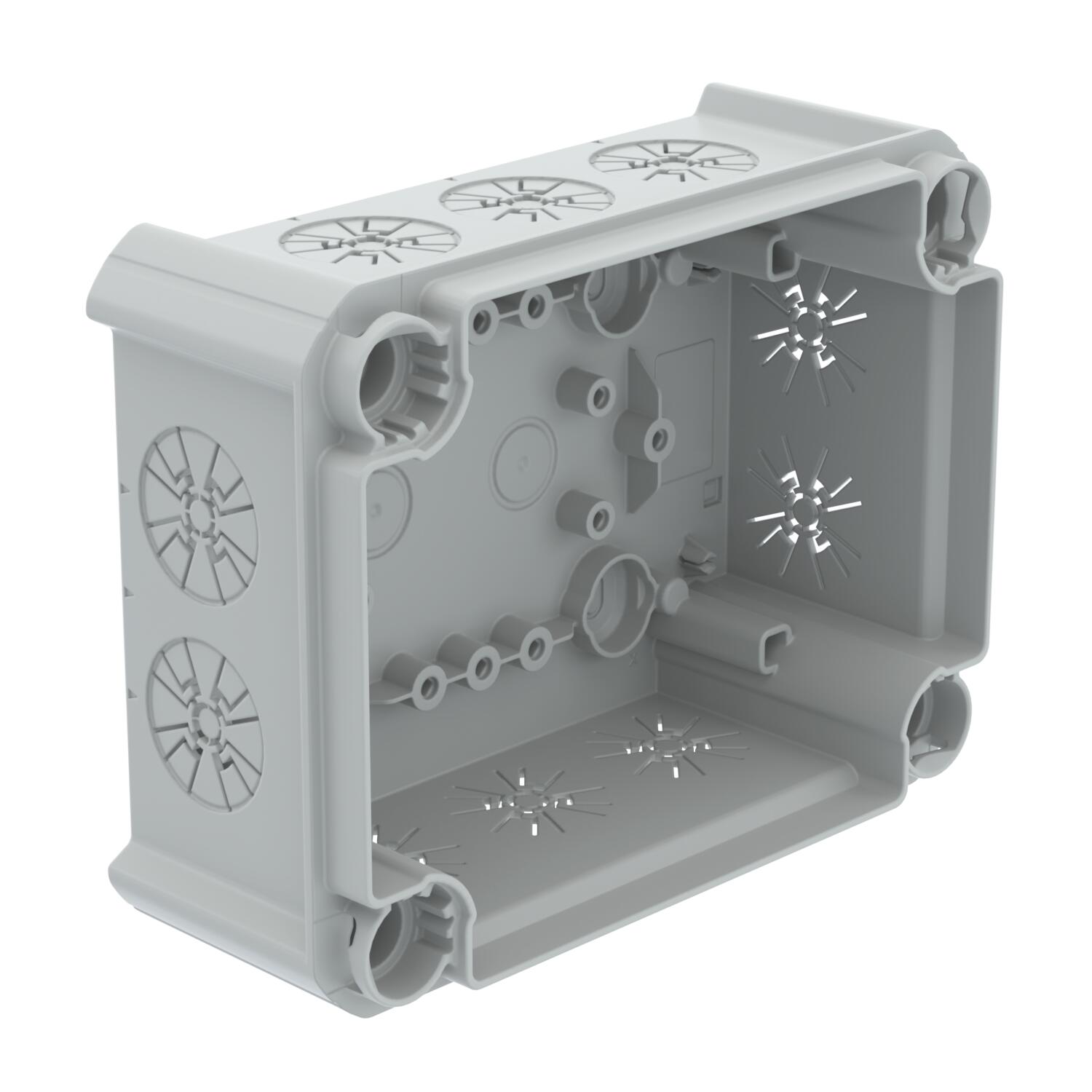 Colour Light grey; RAL 7035 Cover Not transparent Cover fastening Screwed Dimension 150x116x62 Entry from rear yes Equipment Without Expandable yes Explosion-tested version no Flame-resistant acc. to VDE 0471/DIN 695 Part 2-1, test temperature 650°C For Ex zone Without For Ex zone dust Without For Ex zone gas Without for pipe diameter 16/19 mm Halogen-free yes Height 62 mm Length 150 mm Maintain electrical functions Without Material Polypropylene Max. Conductor cross-section 10 mm² Measured insulation voltage Vi 500 V Mounting type Wall/ceiling mounting No. of entries 10 Permitted temperature range, max. 60 °C Permitted temperature range, min. -5 °C Protection rating IP30 Protection rating IK code IK07. Sealable yes Shape Rectangular Transparent lid no Type of entry Cable/pipe Type of housing penetration Pre-marking Weatherproof no Width 116 mm with lid no With screening no - All types