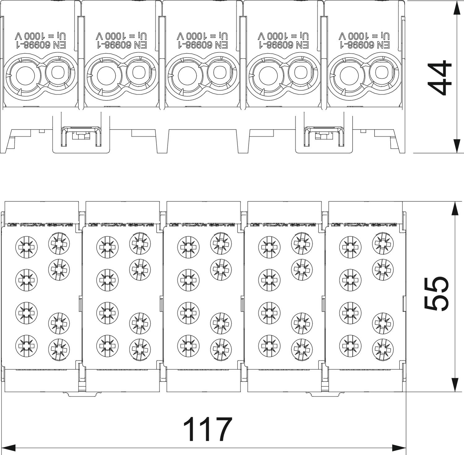 Product description5-pin main terminal block, 2 x 35 mm² + 2 x 25 mm² conductor connection cross-sections per pin. With 2 screws per terminal for secure contact pressure. High-resistance quick-action fastening made of galvanised sheet steel for simple mounting on support rails.