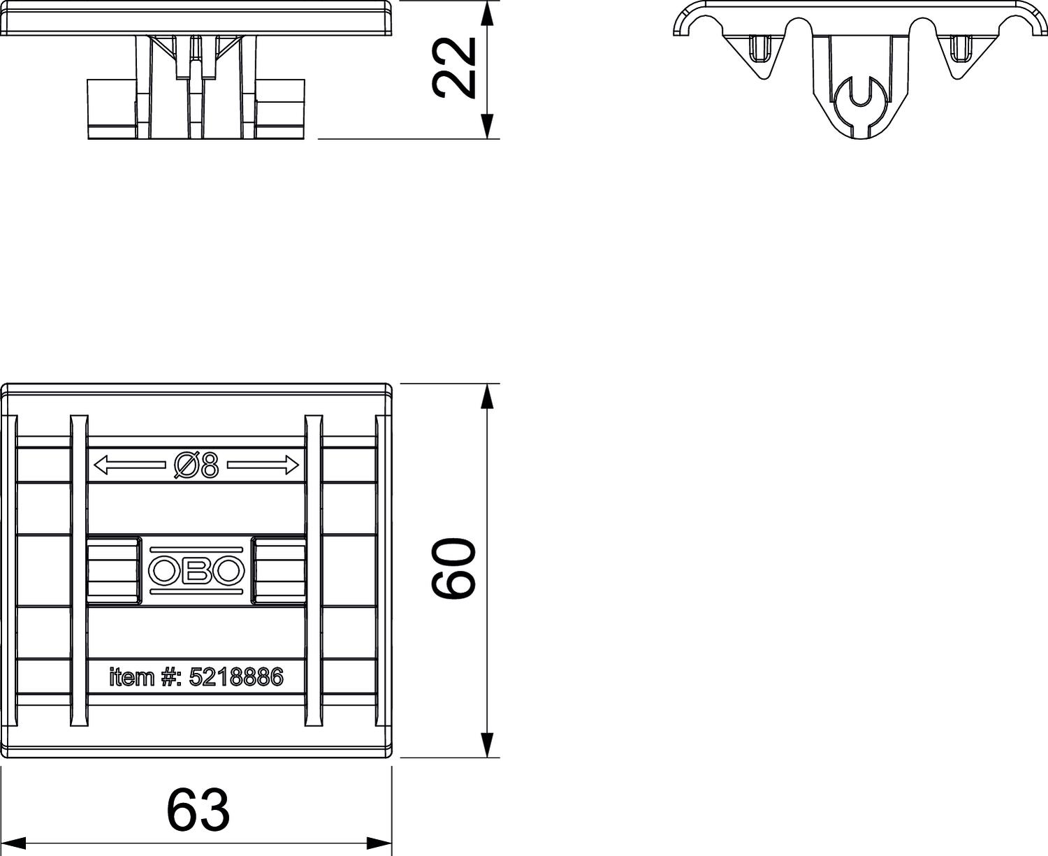 CO2 Footprint (GWP) Cradle-to-Gate 0,0505 kg CO2e / 1 Piece Colour Black Conductor diameter, max. 8 Conductor diameter, min. 8 Dimension 3,9-4,8 Fit Rd 8 mm Height 22,3 mm Length 63 mm Material Polypropylene Width 60,3 mm - All types