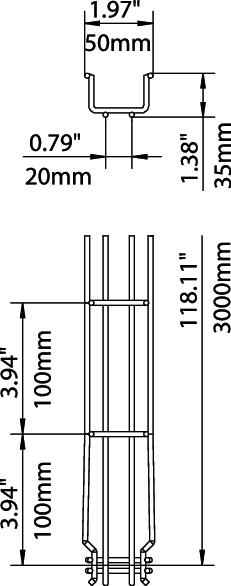 CO2 Footprint (GWP) Cradle-to-Gate 0,8706 kg CO2e / 1 Meter Colour zinc Connector version Integrated connector Dimension 35x50x3000 Dimension B 52 mm Height 1 in Height 35 mm Integrated partition Without Length 3000 mm Load test type according to IEC 61537 Type II Maintain electrical functions no Material Steel Profile shape U-shaped Rustproof steel, pickled no Screwless connector yes Support spacing 1.0 m 0,25 kN/m Support spacing 1.5 m 0,11 kN/m Support spacing 2.0 m 0,1 kN/m Surface Electrogalvanized Type of connector, cable support system Click fastening Usable cross-section 1750 mm² Usable cross-section 9,4 cm² Wide-span version no Width 50 mm Width 1,97 in Wire diameter 3,9 mm Technical data