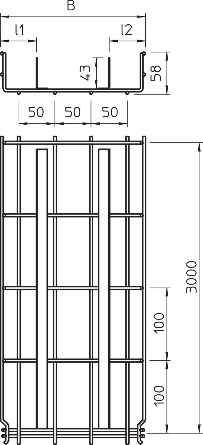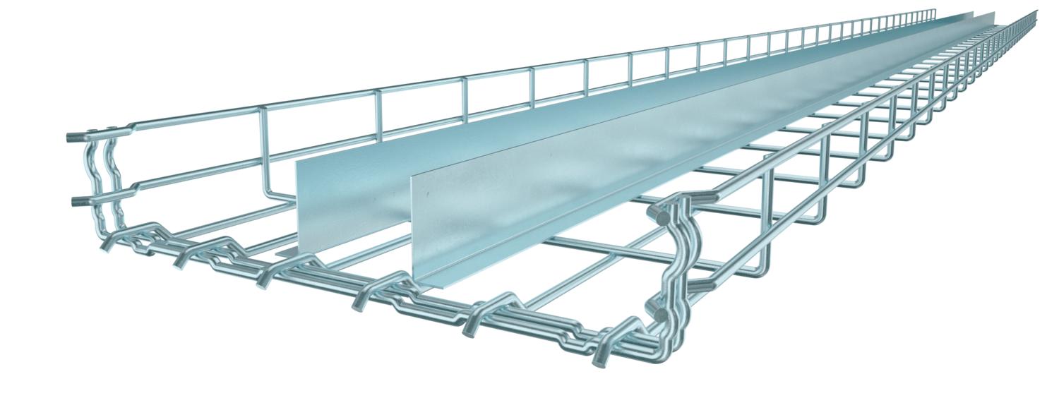 Product descriptionMesh cable tray with shaped connector and two welded barrier strips of side height 55 mm.