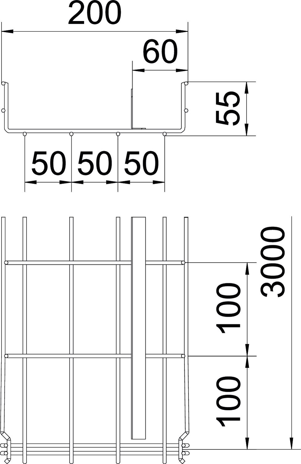 Product descriptionMesh cable tray with shaped connector and welded barrier strips of side height 55 mm.
