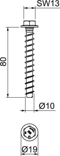 Anchor length 80 mm Anchor/nail/bolt version Spiral anchor Clamping strength 30 mm Colour zinc Dimension 10x80mm Dimension 10 x 80 Dimension L 80 mm Drill hole depth 60 mm Drill hole diameter, min. 8 mm ETA earthquake rating C1 Fire resistance class EN 13501-1 R30, R60, R90, R120 Hardened yes Head diameter 19 mm Head shape Hexagonal Length 80 mm Material Steel Screw system Hexagonal Surface Electrogalvanized Thread 10 Thread diameter ST 10 WAF 13 - All types
