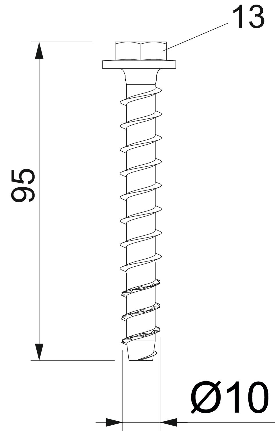 Anchor length 95 mm Anchor/nail/bolt version Spiral anchor Clamping strength 35 mm Colour stainless steel Dimension 10x95mm Dimension 10x95 Dimension L 95 mm Drill hole depth 80 mm Drill hole diameter, min. 8 mm Fire resistance class EN 13501-1 R30, R60, R90, R120 Hardened yes Head diameter 19 mm Head shape Hexagonal Length 95 mm Material Stainless steel 1.4401 Screw system Hexagonal Thread 10 Thread diameter ST 10 WAF 13 - All types