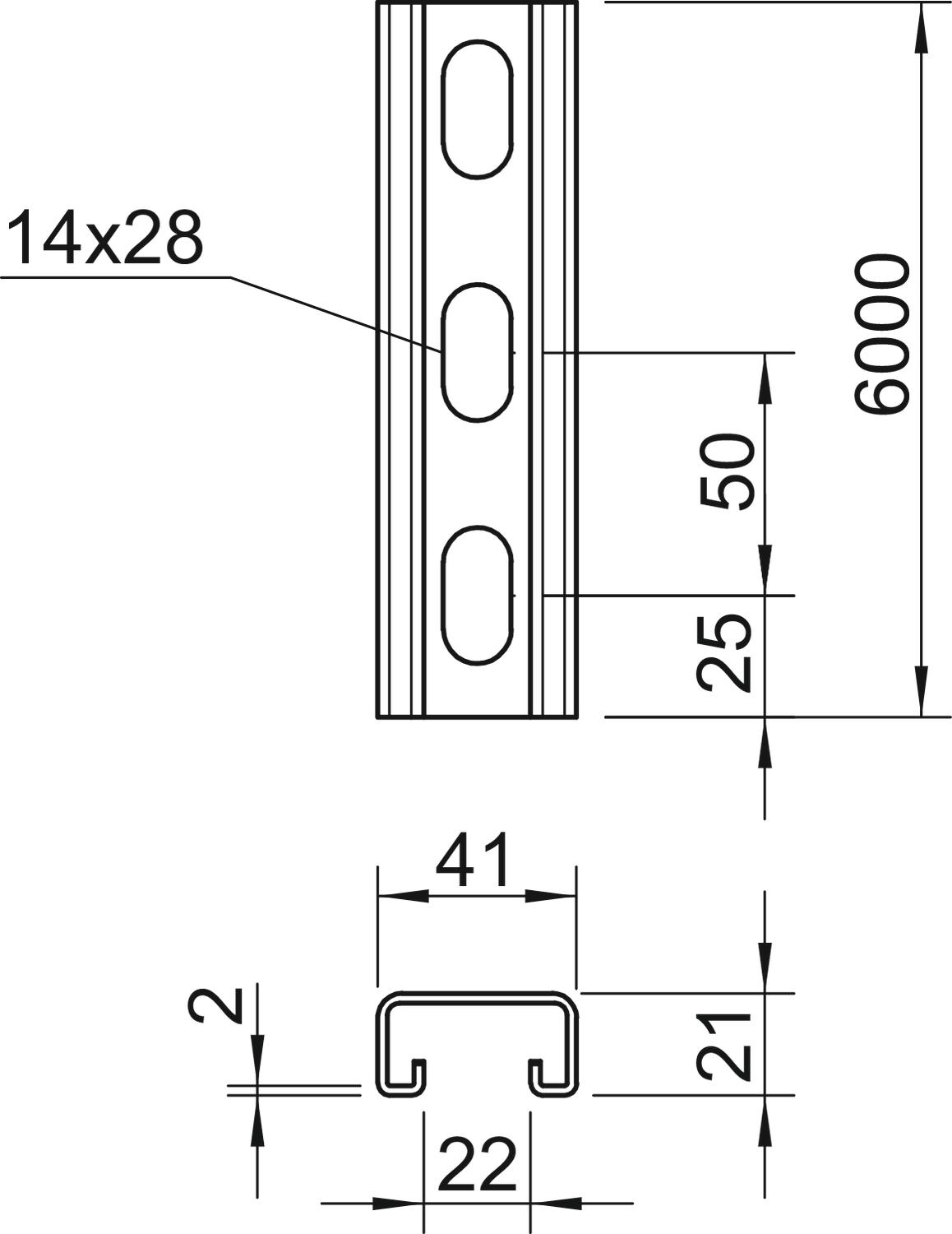 Breakable no CO2 Footprint (GWP) Cradle-to-Gate 7,2882 kg CO2e / 1 Meter Dimension 6000x41x21 Dimension L 6000 mm Drill hole spacing, centre 50 mm Height 21 mm Hole size 14x28 mm Length 6000 mm Maintain electrical functions yes Material Stainless steel 1.4571 Material thickness 2 mm Profile shape C profile Slot width 22 mm Static value A 1,65 cm² Static value ly 0,95 cm⁴ Static value lz 4,51 cm⁴ Static value Wy 0,89 cm³ Static value Wz 2,2 cm³ Surface Bright, treated Type of perforation Perforated back Version for Single profile Width 41 mm With perforation yes With toothing yes - All types