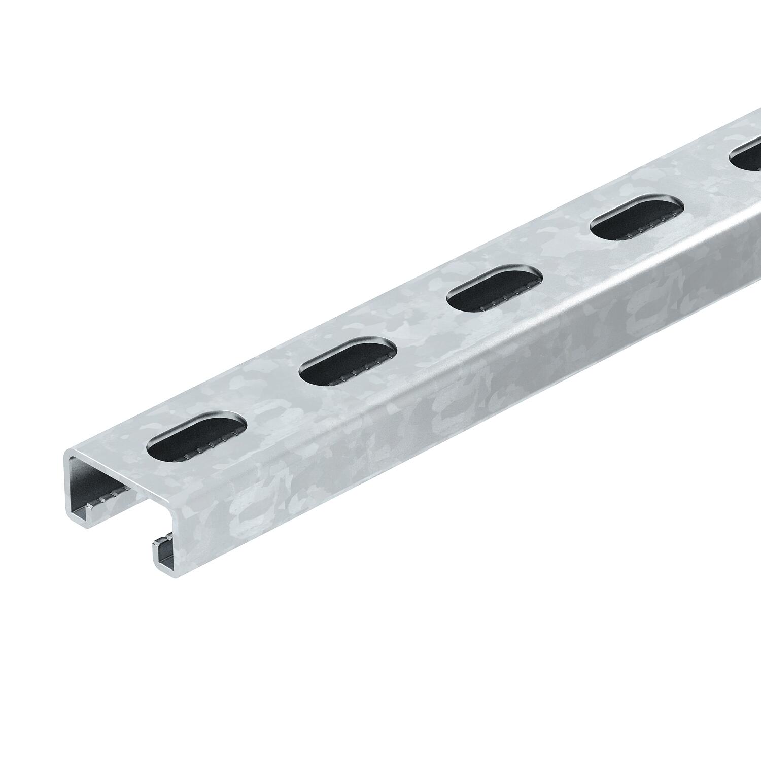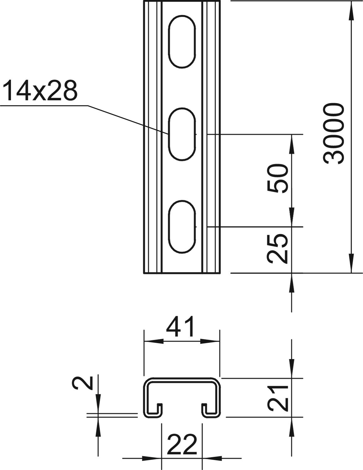 Breakable no CO2 Footprint (GWP) Cradle-to-Gate 3,4275 kg CO2e / 1 Meter Dimension 3000x41x21 Dimension L 3000 mm Drill hole spacing, centre 50 mm Height 21 mm Hole size 14x28 mm Length 3000 mm Maintain electrical functions yes Material Steel Material thickness 2 mm Profile shape C profile Slot width 22 mm Static value A 1,65 cm² Static value ly 0,95 cm⁴ Static value lz 4,51 cm⁴ Static value Wy 0,89 cm³ Static value Wz 2,2 cm³ Surface Strip galvanized Type of perforation Perforated back Version for Single profile Width 41 mm With perforation yes With toothing yes - All types