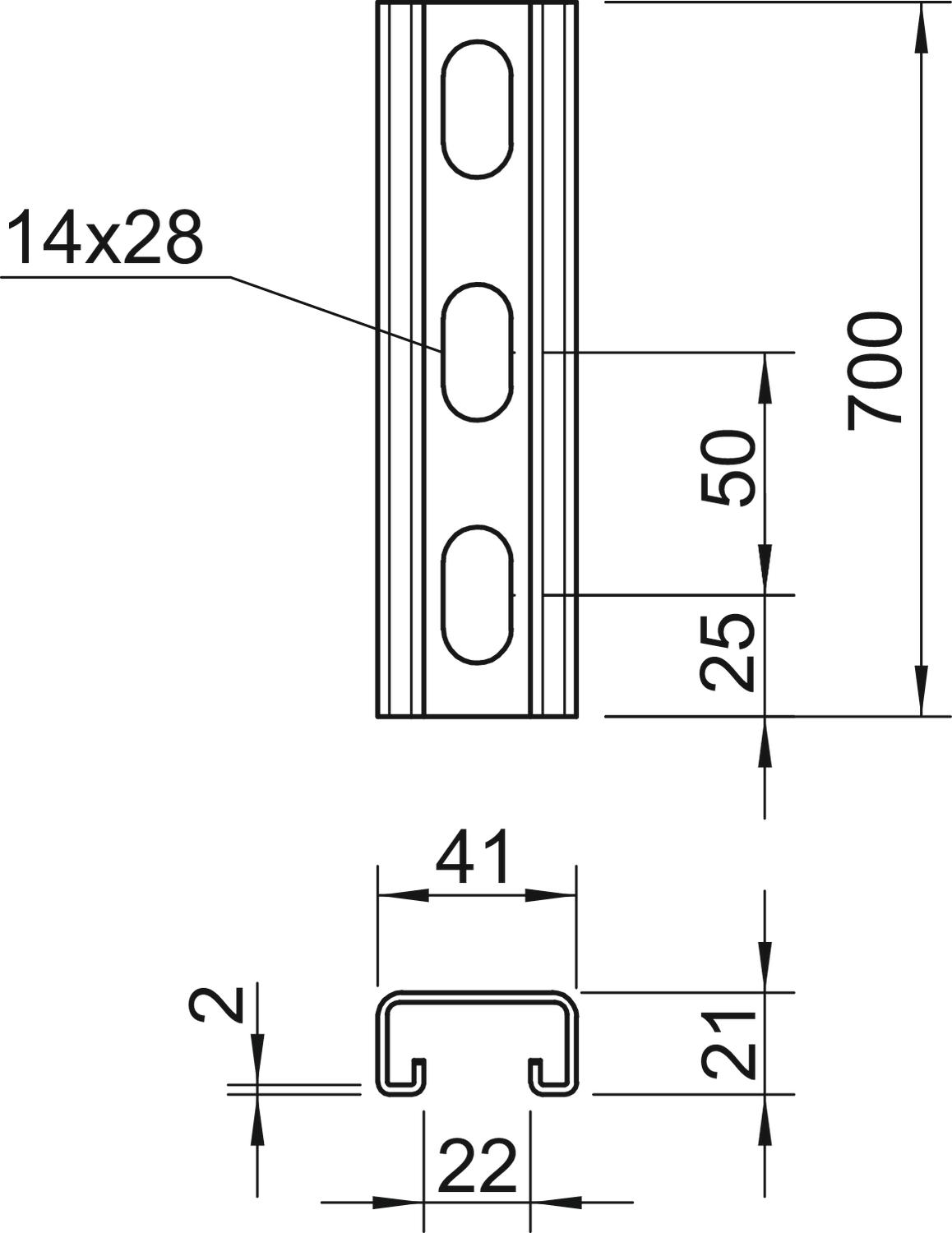 Breakable no CO2 Footprint (GWP) Cradle-to-Gate 2,4224 kg CO2e / 1 Piece Dimension 700x41x21 Dimension L 700 mm Drill hole spacing, centre 50 mm Height 21 mm Length 700 mm Maintain electrical functions yes Material Steel Material thickness 2 mm Profile shape C profile Slot width 22 mm Static value A 1,65 cm² Static value ly 0,95 cm⁴ Static value lz 4,51 cm⁴ Static value Wy 0,89 cm³ Static value Wz 2,2 cm³ Surface Strip galvanized Type of perforation Perforated back Version for Single profile Width 41 mm With perforation yes With toothing yes - All types