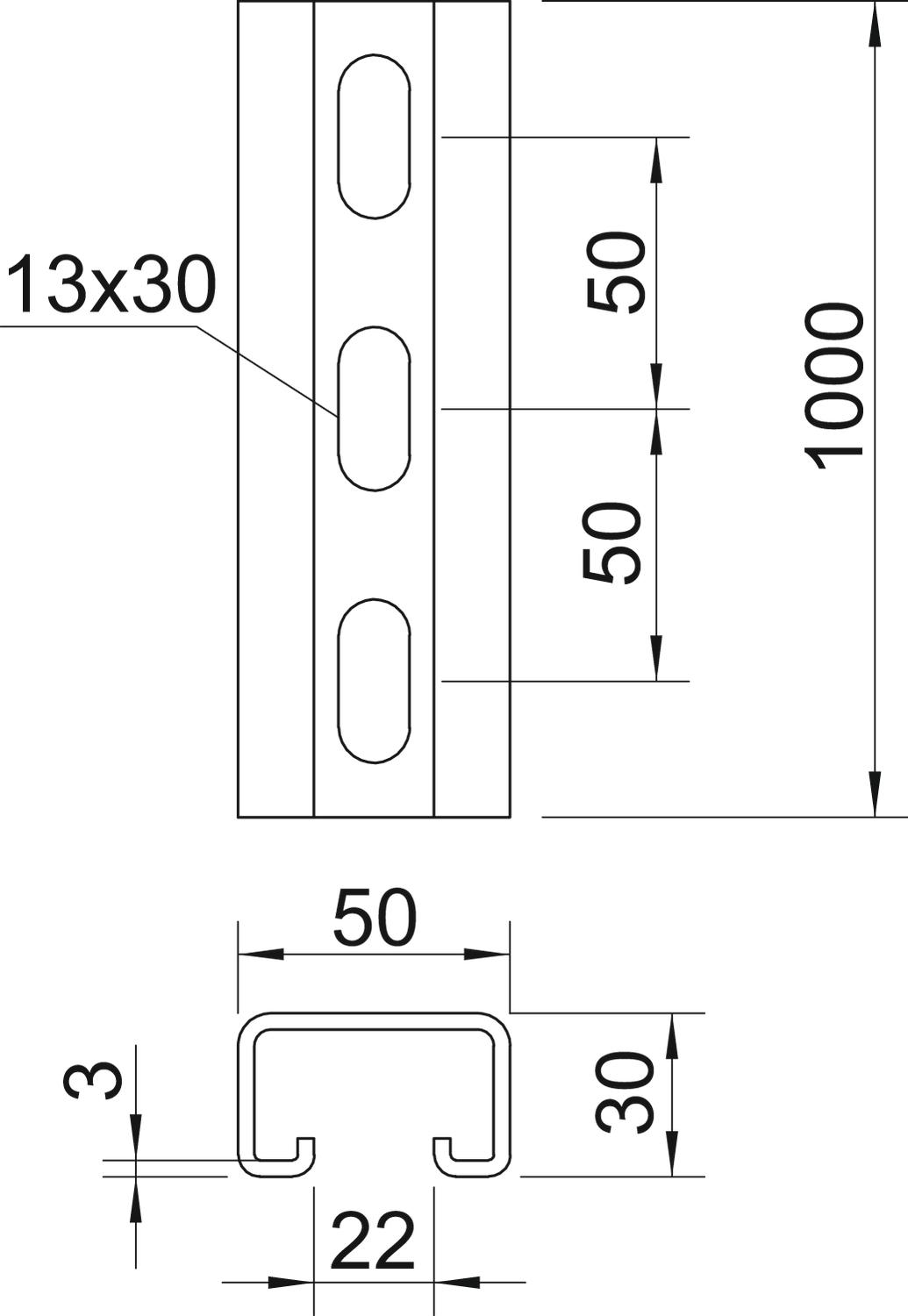 Breakable no CO2 Footprint (GWP) Cradle-to-Gate 6,191 kg CO2e / 1 Meter Dimension 1000x50x30 Dimension L 1000 mm Drill hole spacing, centre 50 mm Height 30 mm Length 1000 mm Maintain electrical functions yes Material Steel Material thickness 3 mm Profile shape C profile Slot width 22 mm Static value A 3,39 cm² Static value ly 3,99 cm⁴ Static value lz 13,11 cm⁴ Static value Wy 3,95 cm³ Static value Wz 6,38 cm³ Surface Hot-dip galvanised Type of perforation Perforated back Version for Single profile Width 50 mm With perforation yes With toothing no - All types
