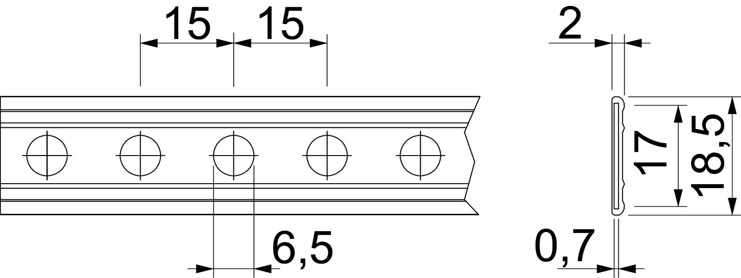 Colour Black Dimension 18,5x2mm Dimension 18,5 x 2 Dimension A 15 mm Dimension b 17 mm Dimension b1 18,5 mm Dimension d 6,5 mm Dimension t 0,7 mm Dimension t1 (mm) 2 Halogen-free yes Hole diameter 6,5 mm In the holder yes Material Steel per rolls 10 Perforation Round Size II Surface Strip galvanized / plastic coated Version for Perforated - All types