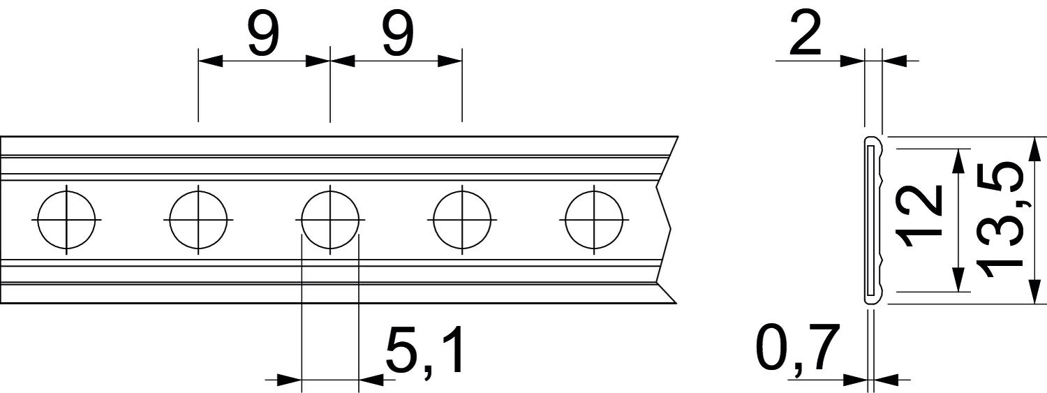 Colour Black Dimension 13,5x2mm Dimension 13,5 x 2 Dimension A 9 mm Dimension b 12 mm Dimension b1 13,5 mm Dimension d 5,1 mm Dimension t 0,7 mm Dimension t1 (mm) 2 Halogen-free yes Hole diameter 5,1 mm In the holder yes Material Steel per rolls 10 Perforation Round Size I Surface Strip galvanized / plastic coated Version for Perforated - All types