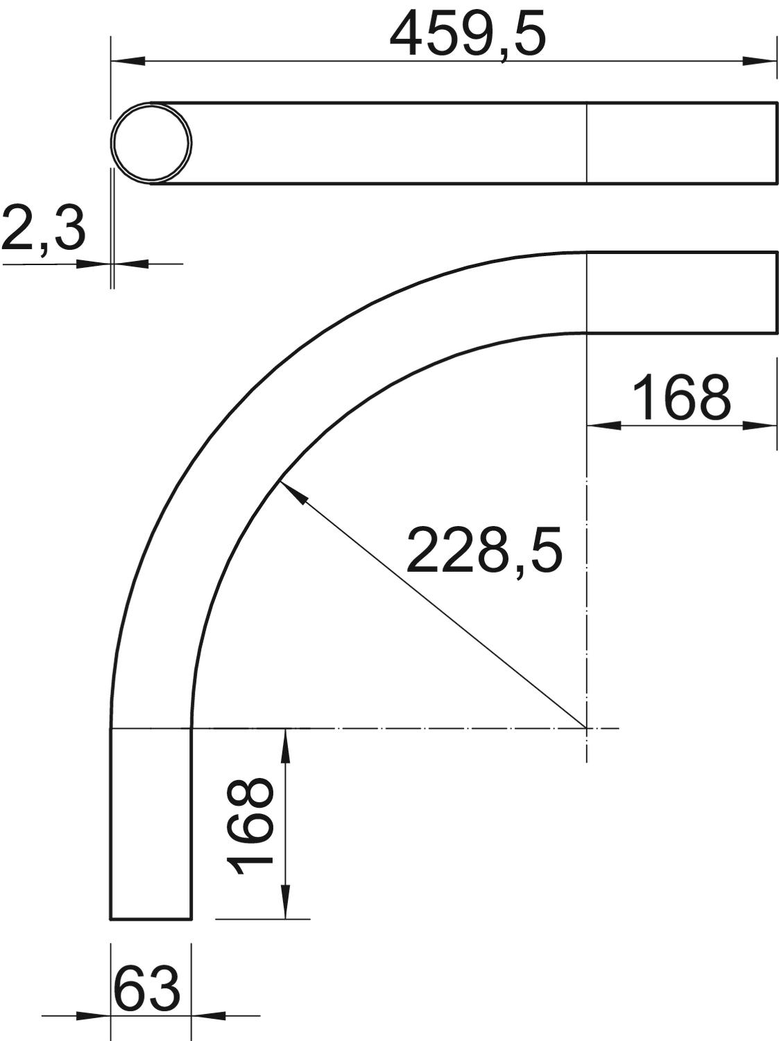 Angle of the bend 90 ° Colour Light grey; RAL 7035 Dimension Ø63mm Dimension A 168 mm Dimension D 63 mm Dimension L 459,5 mm Dimension m (mm) M63 Dimension R 228,5 mm Dimension t 2,3 mm Flexible no For nominal pipe diameter 63 mm Halogen-free yes Length 459,5 mm Material Polycarbonate/Acrylnitrile-butadiene-styrene Version for Connector With sleeve no - All types