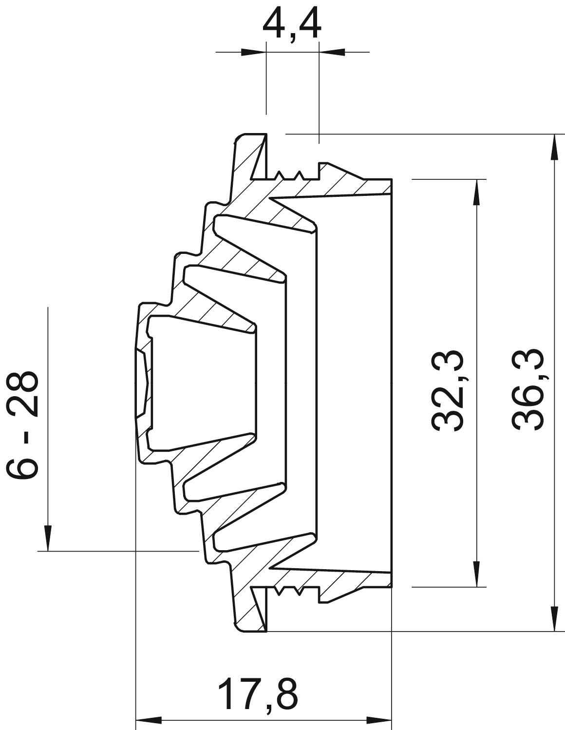 CO2 Footprint (GWP) Cradle-to-Gate 0,041 kg CO2e / 1 Piece Colour Light grey; RAL 7035 Dimension M32 Dimension A 4,4 mm Dimension D1 36,3 mm Dimension D2 32,3 mm Dimension D3 6 mm Dimension D4 10 mm Dimension D5 15 mm Dimension L 17,8 mm Dimension t 4,4 mm Flame-resistant acc. to VDE 0471/DIN 695 Part 2-1, test temperature 650°C for diameter, max. 28 mm for wall thickness, max. 4,4 for wall thickness, min. 4,4 Halogen-free yes Material Ethylene vinyl acetate Nominal diameter 32 mm Protection rating IP54 Size M32 Version for Cuttable - All types