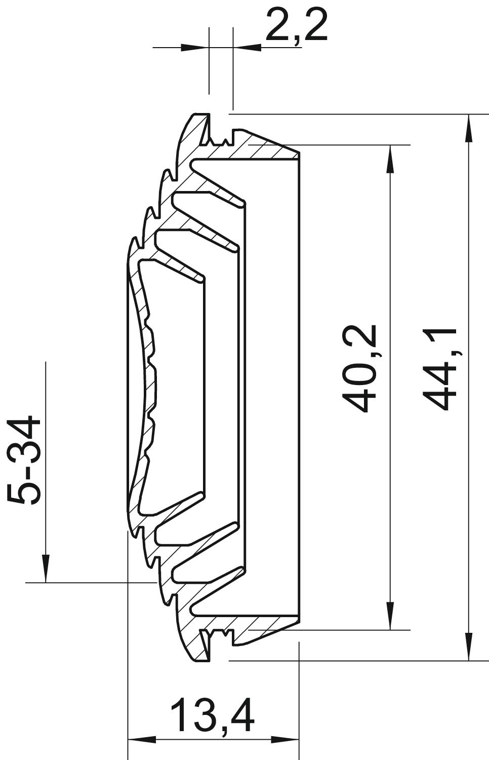CO2 Footprint (GWP) Cradle-to-Gate 0,0404 kg CO2e / 1 Piece Colour Pastel orange; RAL 2003 Dimension M40 Dimension A 2,2 mm Dimension D1 44,1 mm Dimension D2 40,2 mm Dimension D3 5 mm Dimension D4 10 mm Dimension D5 15 mm Dimension L 13,4 mm for diameter, max. 34 mm for wall thickness, min. 2,2 Halogen-free no Material Thermoplastic elastomer Nominal diameter 40 mm Size M40 Version for Cuttable - All types
