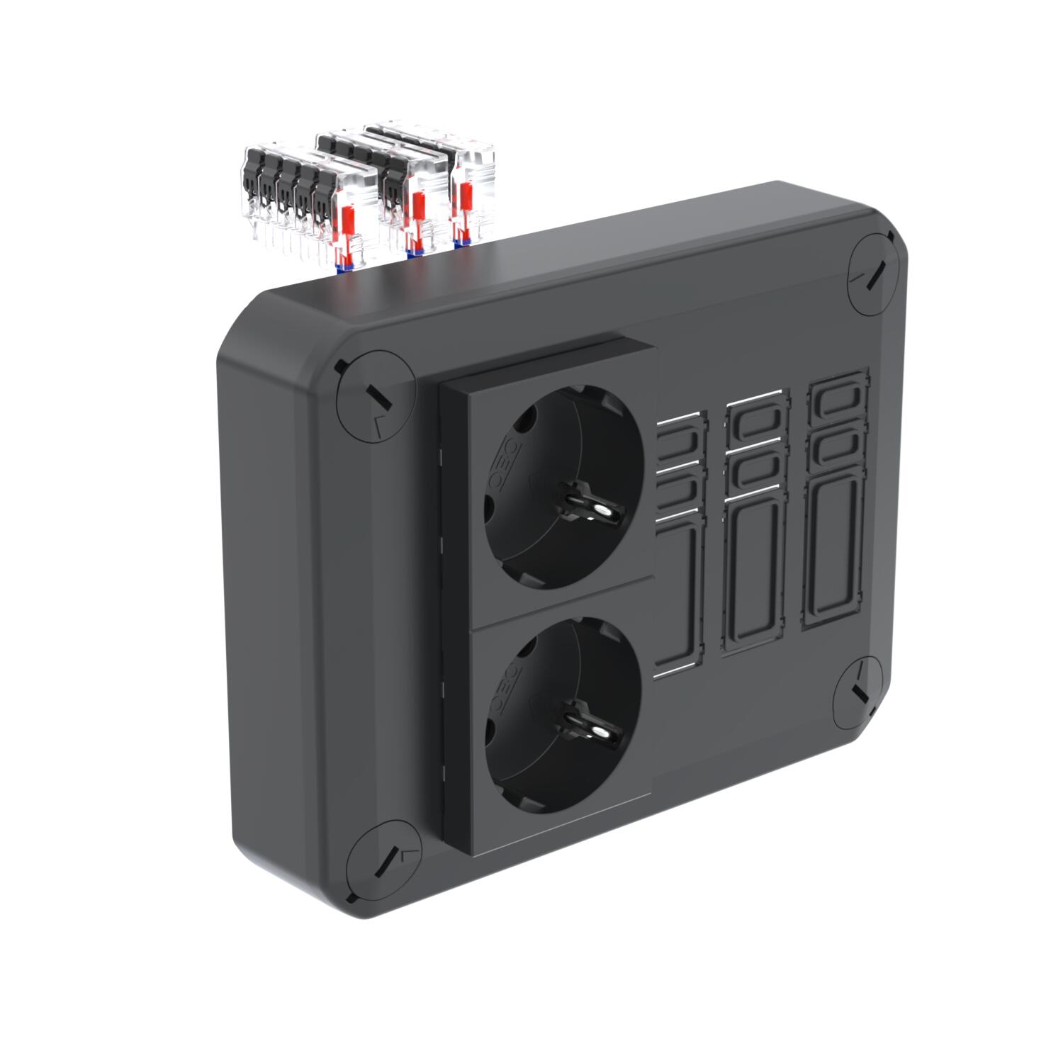 Product descriptionPluggable cover for the closing of junction boxes, equipped with 2 Module 45 sockets, prewired with lever plug-in connector With quick lock in cover, sealable. Halogen-free material, UV-resistant Flame-resistant to DIN EN 60695/2/11, test temperature 650 °C. Impact resistance IK07 at room temperature. Protection rating IP30