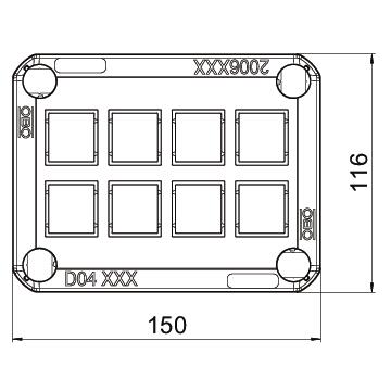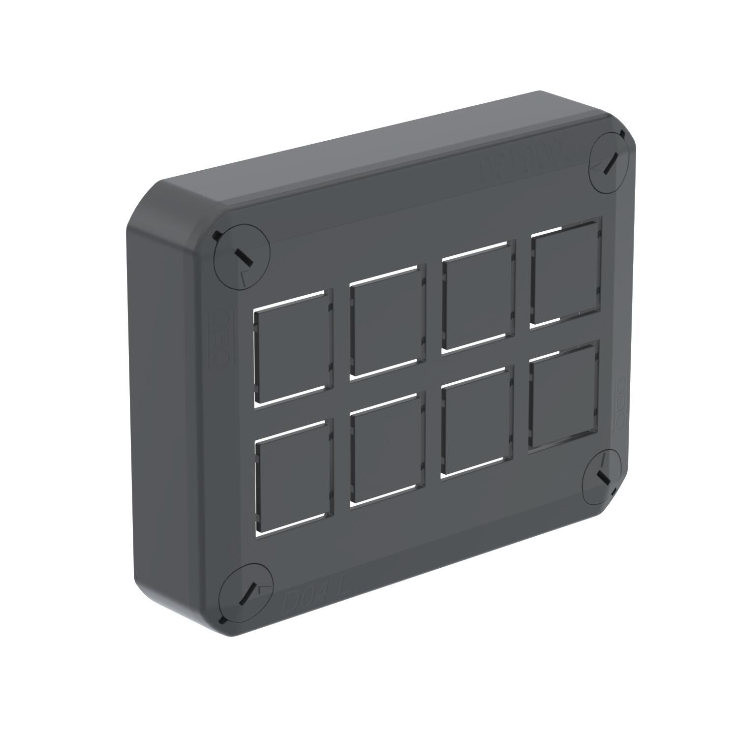 Pluggable cover for the closing of junction boxes, equipped with break-out openings for multiple-pole systems or DATA systems based on Keystone. With quick lock in cover, sealable. Halogen-free material, UV-resistant Flame-resistant to DIN EN 60695/2/11, test temperature 650 °C. Impact resistance IK07 at room temperature. Protection rating IP30