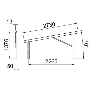 Adjustable no Alignment Vertical Anchoring free-standing Angle of inclination, max. 10 ° Angle of inclination, min. 10 ° Angle α 10 Cable duct optional yes Cable duct, integrated no CO2 Footprint (GWP) Cradle-to-Gate 65,0827 kg CO2e / 1 Piece Colour zinc Dimension 2689x91x1376 Dimension H 1,38 mm Dimension L 2,71 mm Dimension l 2,27 mm Height 1376 mm Length 2689 mm Material Steel Module height max. 50 mm Module height min. 20 mm Module length max. 1850 mm Module length min. 1600 mm Module width max. 1310 mm Module width min. 990 mm Mounting type photovoltaic mounting systems Floor Penetration of roof necessary no Suitable for roof material Other Surface Hot-dip galvanised Width 91 mm - All types