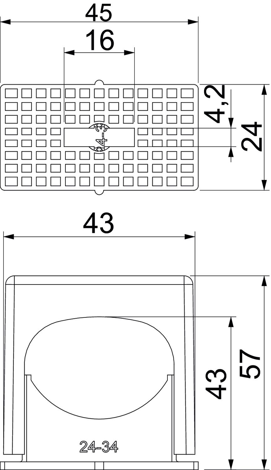 Clamping range D, max. 34 mm Clamping range D, min. 24 mm CO2 Footprint (GWP) Cradle-to-Gate 0,0524 kg CO2e / 1 Piece Colour Light grey; RAL 7035 Dimension 24-34mm Dimension a 45 mm Dimension a1 (mm) 16 mm Dimension b 24 mm Dimension b1 4,2 mm Dimension c 43 mm Dimension d 43 mm Dimension e 57 mm Expandable no Fastening type Screw hole Halogen-free yes Impact-resistant yes Material Polystyrene Number of cables/pipes 1 - All types