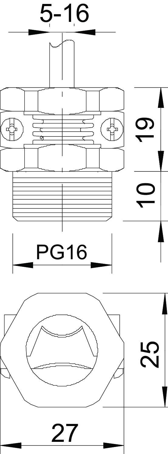 Clamping range, max. 16,2 mm Clamping range, min. 5 mm CO2 Footprint (GWP) Cradle-to-Gate 0,0391 kg CO2e / 1 Piece Colour Light grey; RAL 7035 Dimension PG16 Dimension E 27 mm Dimension L1 10 mm Dimension L2 19 mm Fibre-glass reinforced no Halogen-free yes Impact-resistant no Material Polyamide Nominal thread size 16 Strain relief option yes Thread increase 1,41 mm Thread type PG WAF 25 - All types