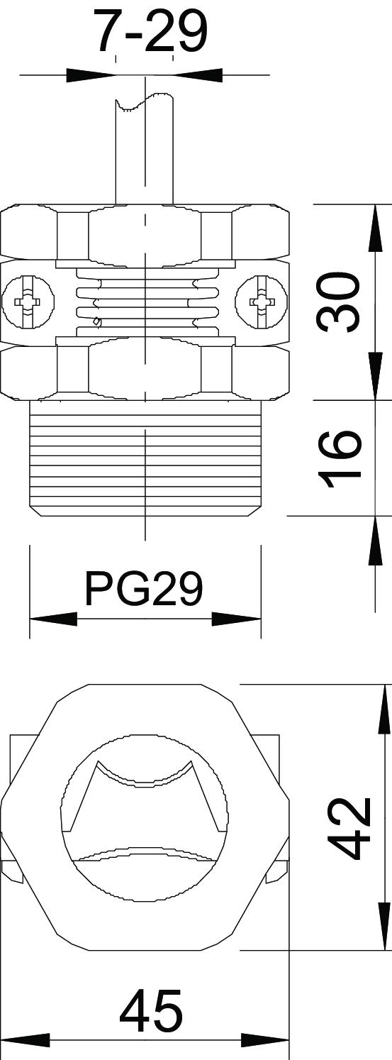 Clamping range, max. 29 mm Clamping range, min. 7,1 mm CO2 Footprint (GWP) Cradle-to-Gate 0,1505 kg CO2e / 1 Piece Colour Light grey; RAL 7035 Dimension PG29 Dimension E 45 mm Dimension L1 16 mm Dimension L2 30 mm Fibre-glass reinforced no Halogen-free yes Impact-resistant no Material Polyamide Nominal thread size 29 Strain relief option yes Thread increase 1,59 mm Thread type PG WAF 42 - All types
