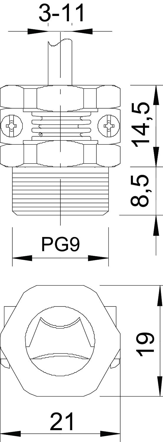 Clamping range, max. 11,3 mm Clamping range, min. 3,5 mm CO2 Footprint (GWP) Cradle-to-Gate 0,0166 kg CO2e / 1 Piece Colour Light grey; RAL 7035 Dimension PG9 Dimension E 21 mm Dimension L1 8,5 mm Dimension L2 14,5 mm Fibre-glass reinforced no Halogen-free yes Impact-resistant no Material Polyamide Nominal thread size 9 Strain relief option yes Thread increase 1,41 mm Thread type PG WAF 19 - All types