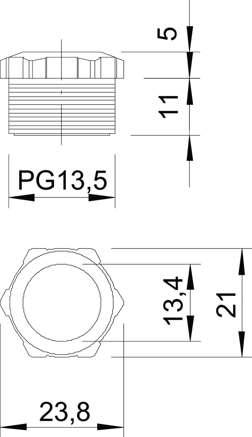 CO2 Footprint (GWP) Cradle-to-Gate 0,0161 kg CO2e / 1 Piece Colour Light grey; RAL 7035 Dimension PG13,5 Dimension D 13,4 mm Dimension L1 10,5 mm Dimension L2 5 mm Fibre-glass reinforced yes Halogen-free yes Impact-resistant no Material Polyamide Nominal thread size 13,5 Strain relief option no Thread increase 1,41 mm Thread type PG WAF 21 - All types